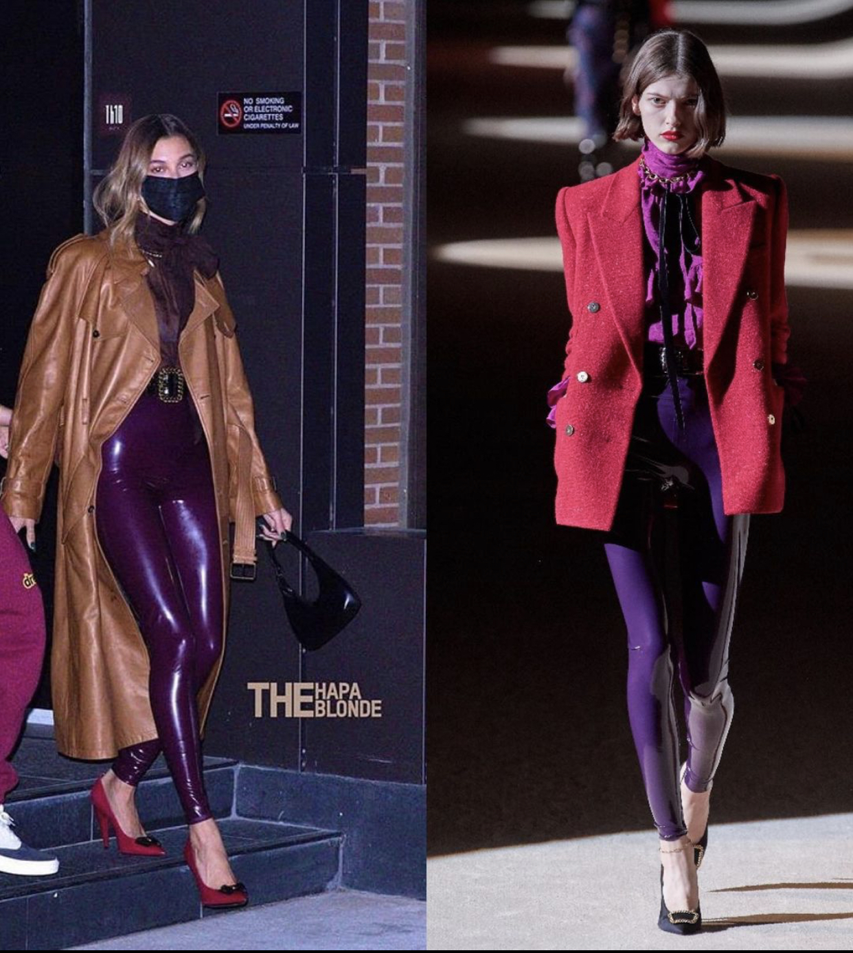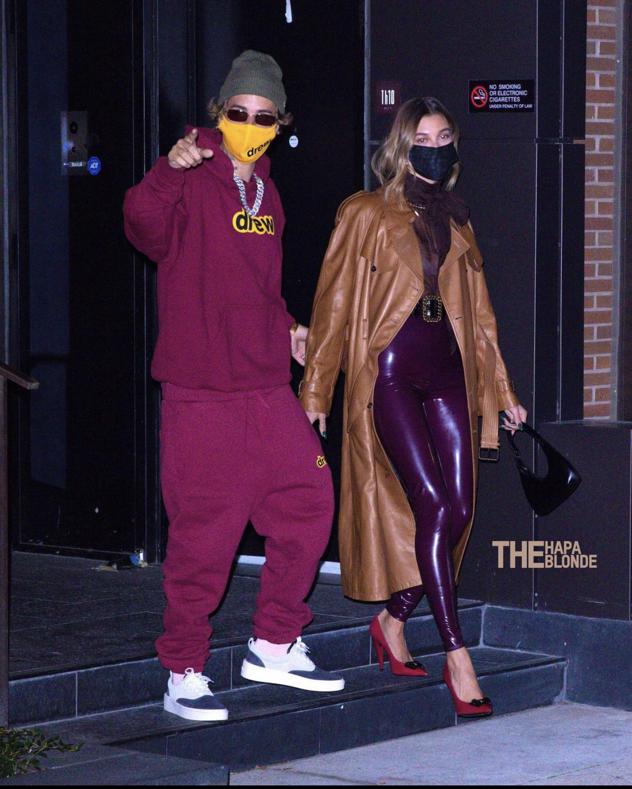 Hailey Bieber wore a Saint Laurent FW20 RTW leather look during date night while Justin Bieber opted for a casual look featuring a Drew House hoodie and sweatpants along with Vans. Hailey’s look was styled by Maeve Reilly.