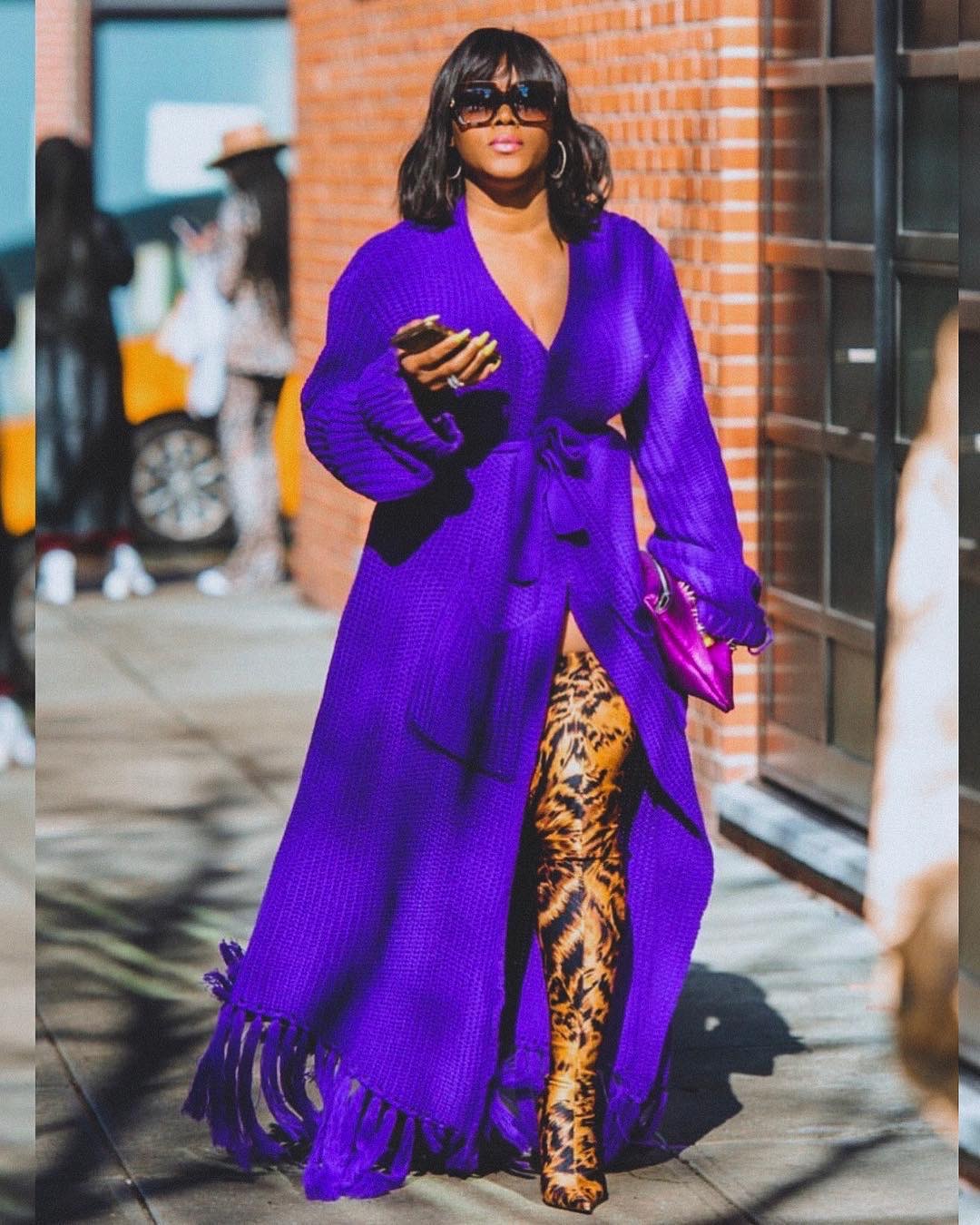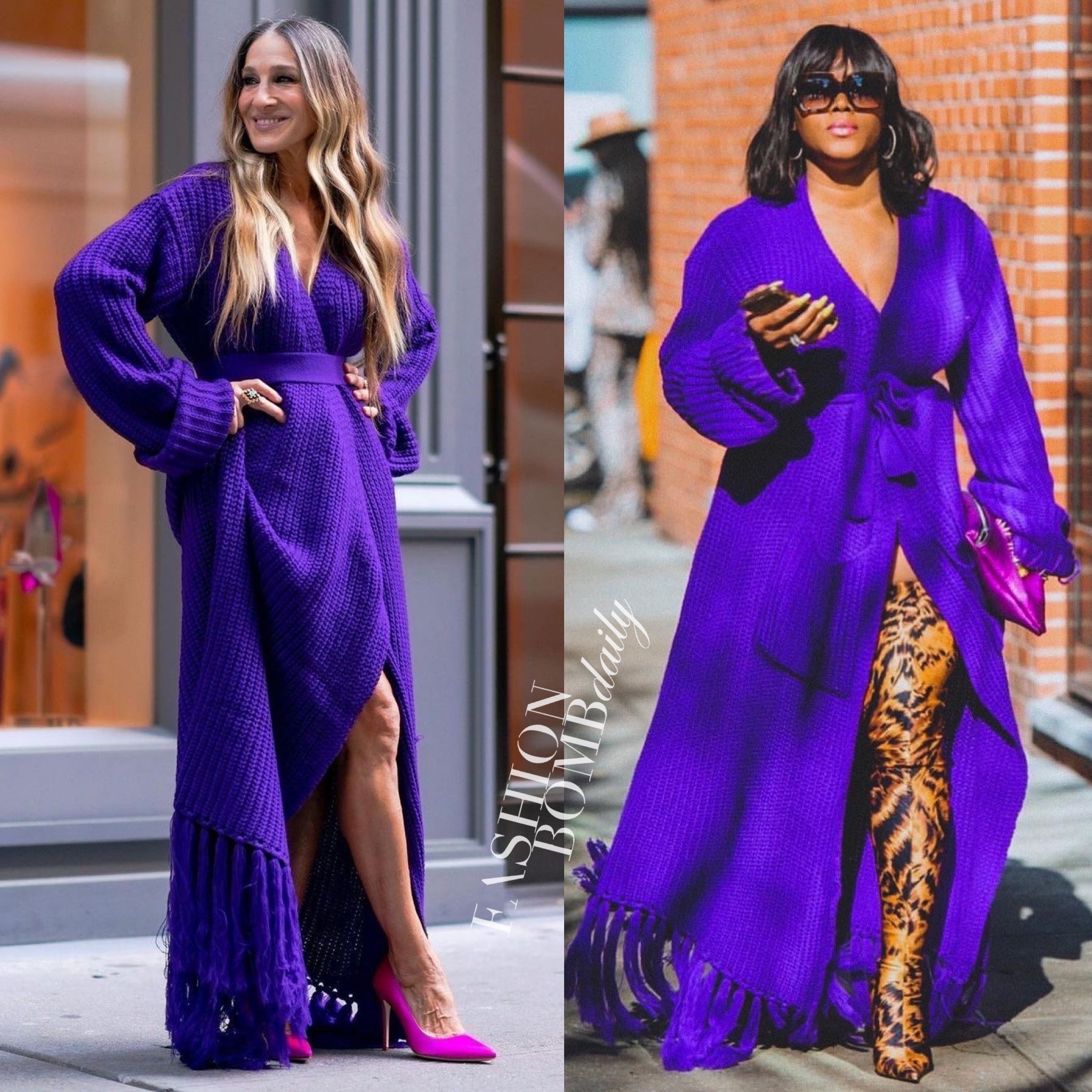 We have been rocking with Hanifa from the very start, and are juiced to see so many celebs discover the bomb brand! One of the new bold faces in Hanifa? Sarah Jessica Parker, who stepped out in the same $209 Miya Purple Wrap Cardigan Dress previously worn by our EIC Claire Sulmers.