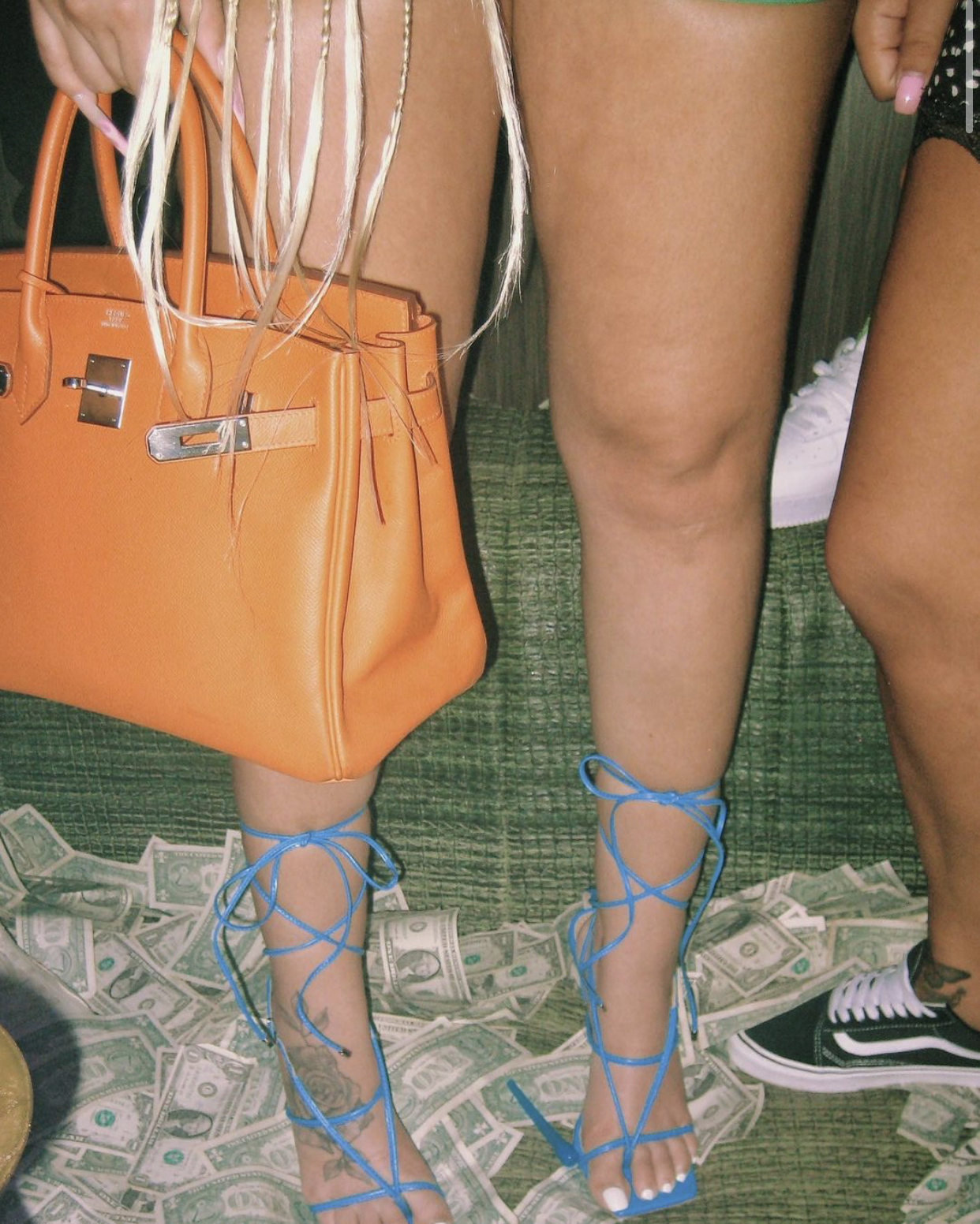 Mulatto wore a reworked Coogi dress by Peezy paired with an orange Hermés Birkin bag, blue lace-up Public Desire heeled sandals, and Dior sunglasses. Her look was styled by her partner-in-style Todd White. Her braids was executed by @thedessystylez.