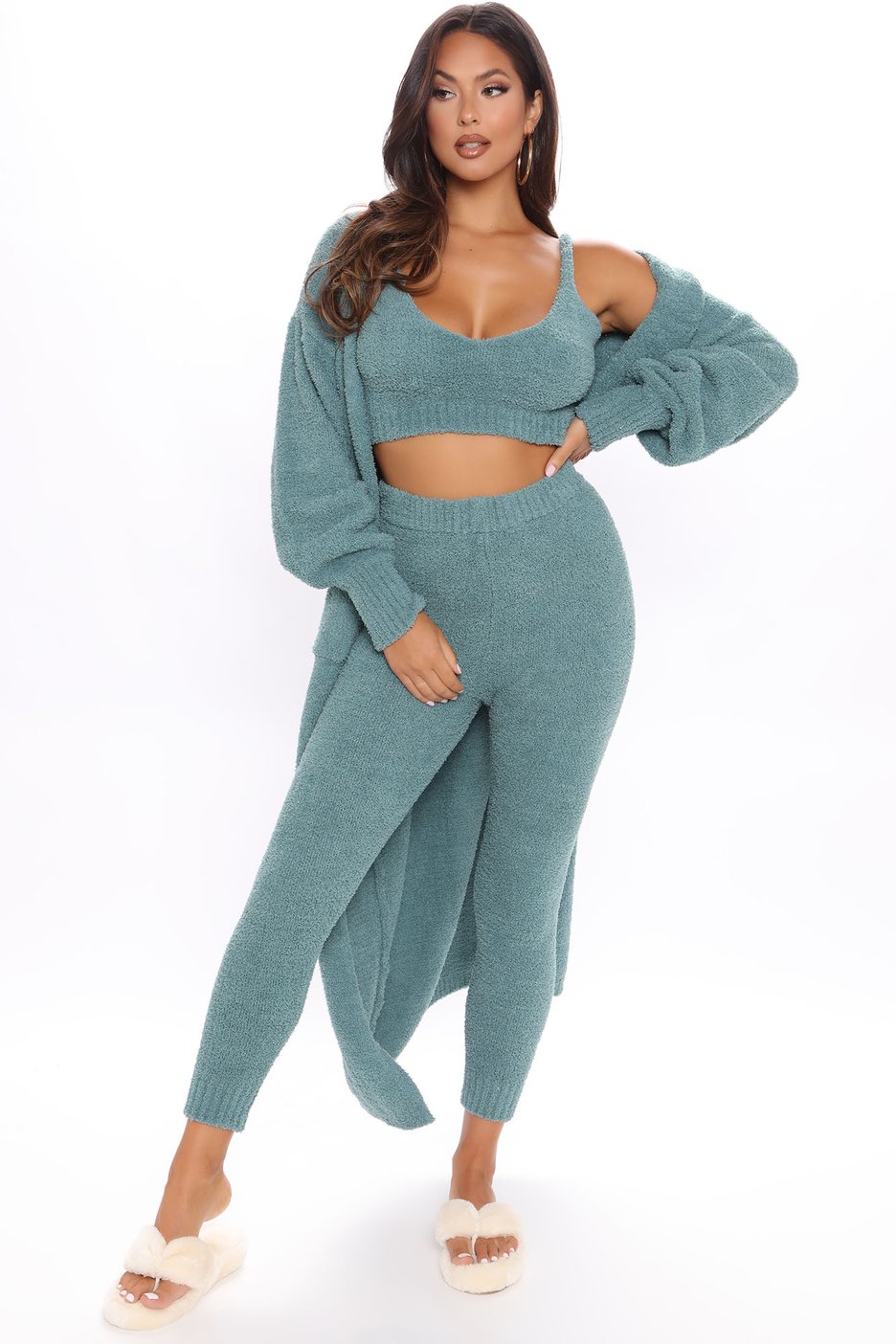 Bernice Burgos wore Fashion Nova’s Living In It Three Piece Legging Set in teal! For the price of $79.99, the stretchy set features a crop tank, leggings, and a long sleeve maxi cardigan in a soft-to-touch knit fabric. It is also available in pink, plum, and ivory.