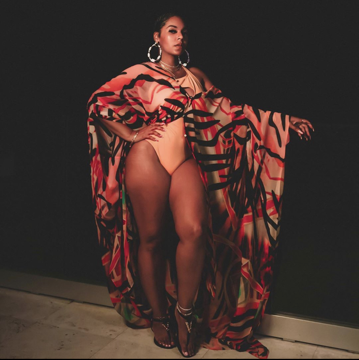 Ashanti donned the Sai Sankoh Goddess Kaftan from the BeautyLifeFun Shop which she paired with an orange one-piece bathing suit and Versace sandals, styled by Tim B.! The goddess kaftan was quite fitting for the goddess Ashanti and her island vacay.