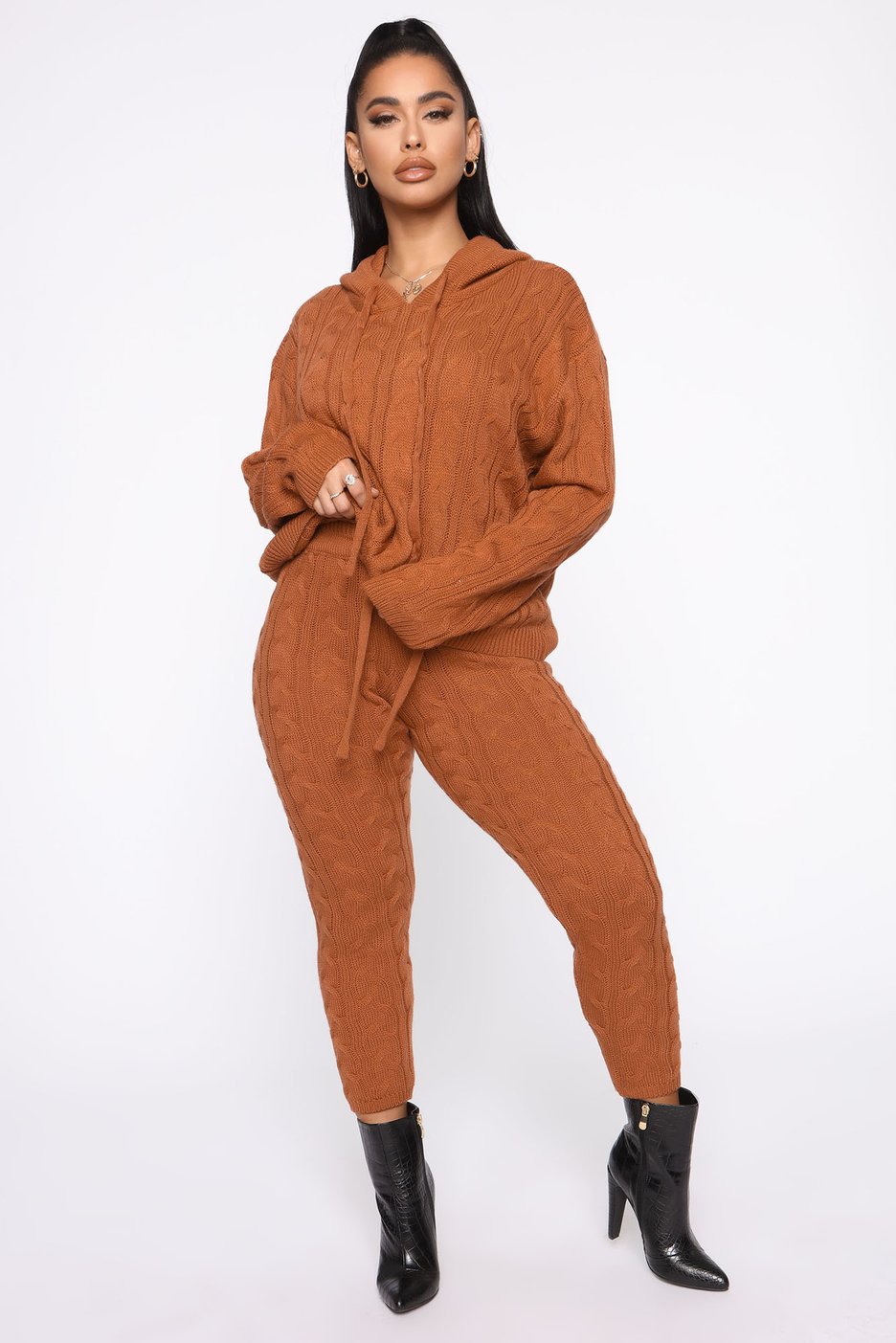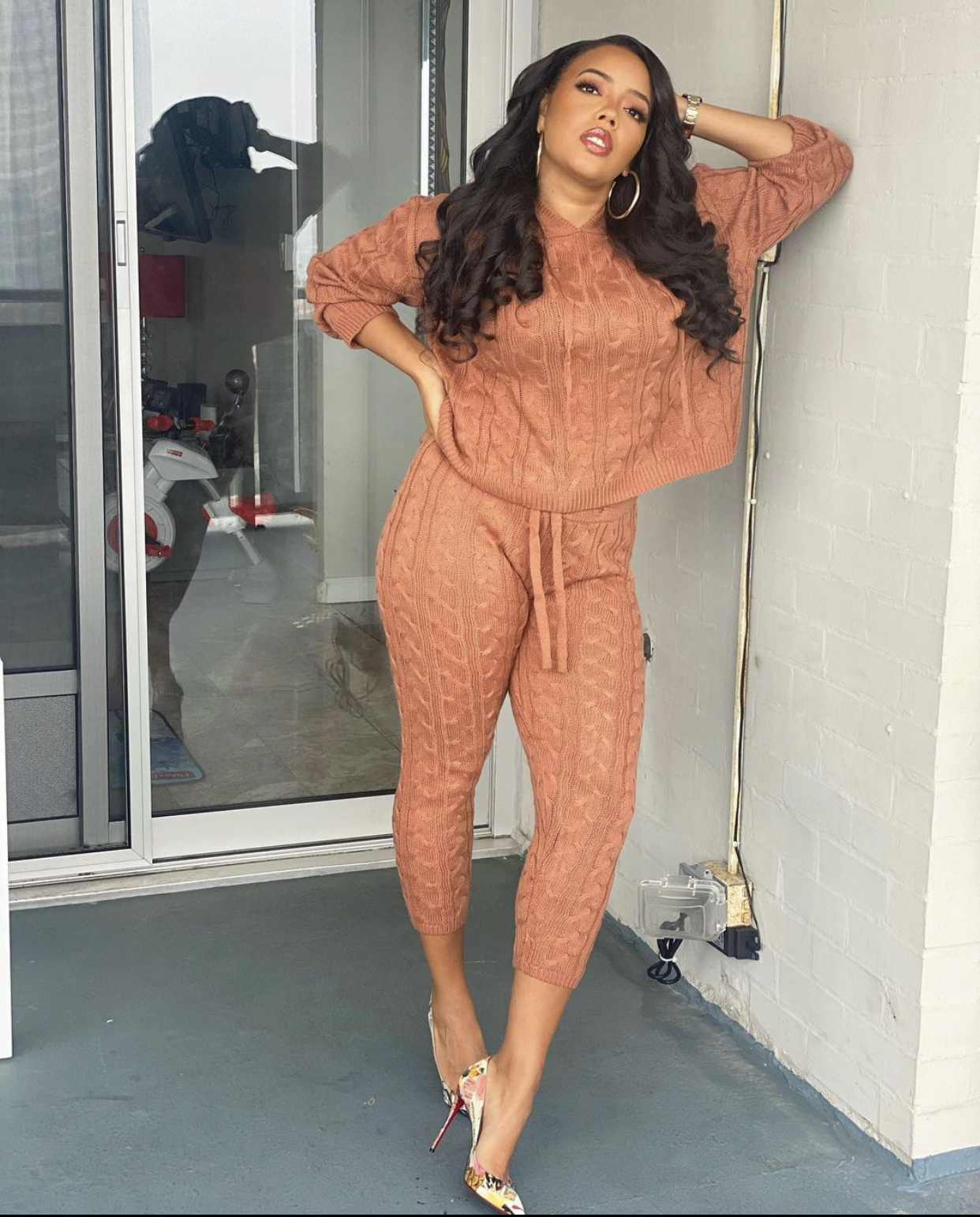 Angela Simmons was rocking Fashion Nova’s Can You Knit It Sweater Set in camel! The set features a hooded sweater and drawstring high-waist joggers in a cable knit fabric. The seasonal color options of beige, black, burgundy, hunter, and heather grey make this set perfect for Fall.