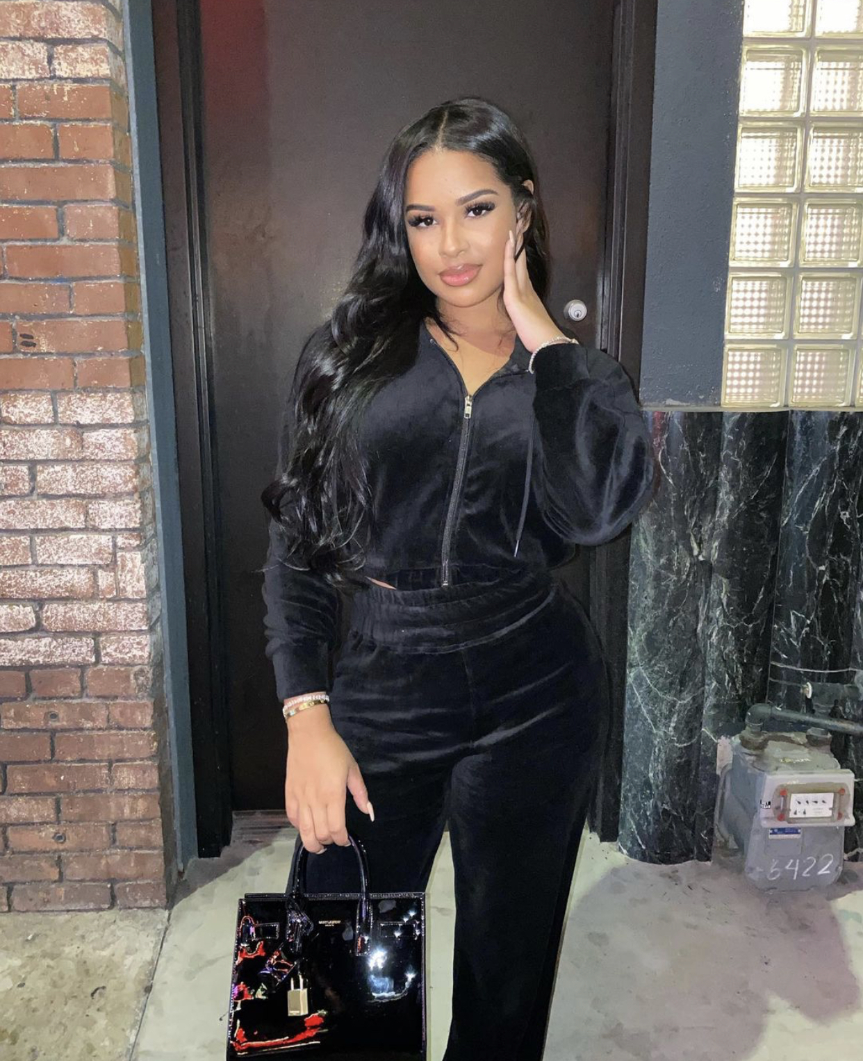 Taina Williams was spotted out one night in an all-black velour Fashion Nova look that she dressed up with a Saint Laurent bag and heeled sandals!