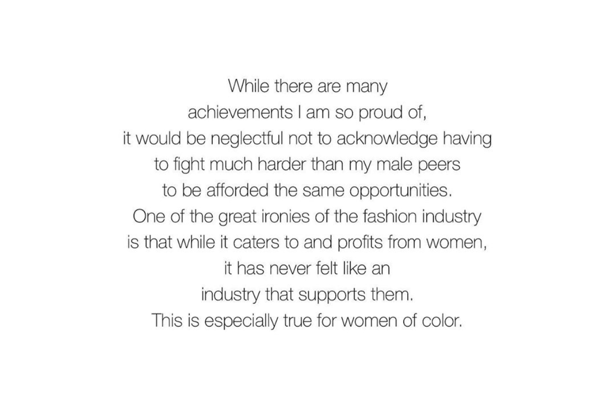 She also described that she was also placed at a disadvantage as a Black woman as she witnessed male counterparts in the fashion industry get awarded with more favorable circumstances: “While there are many achievements I am so proud of, it would be neglectful not to acknowledge having to fight much harder than my male peers to be afforded the same opportunities.“