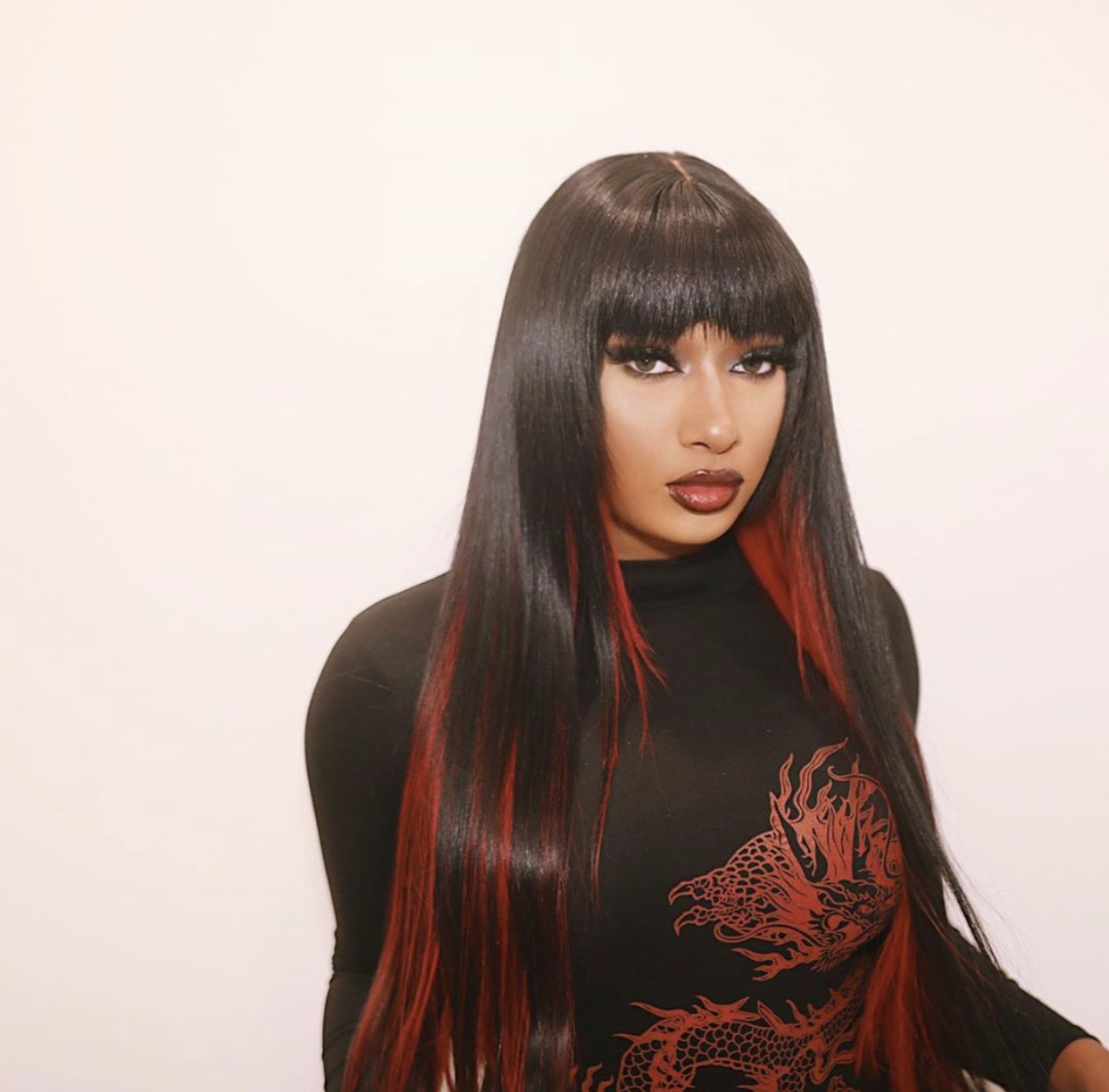 Megan Thee Stallion took to Instagram last night to share a fiery look inspired by anime character Yumeko Jambami of Kakegurui. She channeled the character with a sleek black bang-cut wig with red highlights and a Fashion Nova romper!