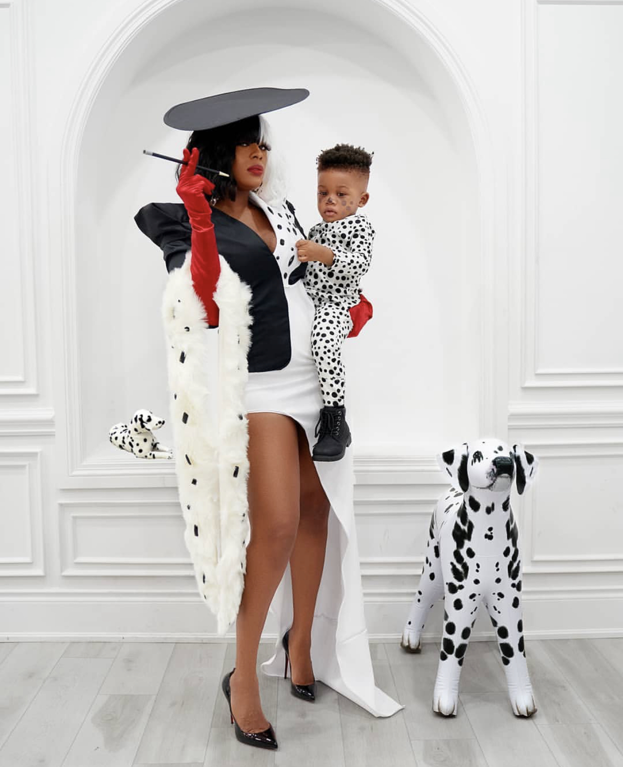 @mrsbarbarankansah and her son @jeremiahjjnkansah dressed up as Cruella Devil and a Dalmatian from 101 Dalmatians! The look included a dress, dalmatian onesie and faux fur from @jdanquahdesigns along with a hat from @shop.jvaccessories, styled by @k.stylz__. Her glam included makeup by @a.onthebeat, hair by @allurebyhk, and eyelashes by @she.winkss. She shot this look at @visionroom.ca.