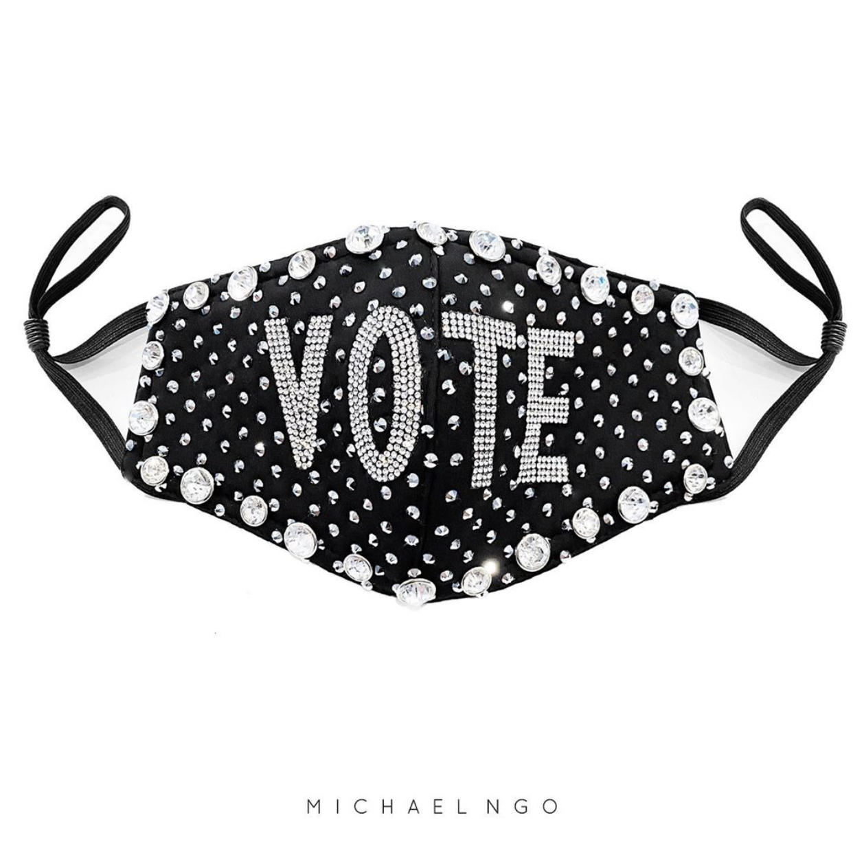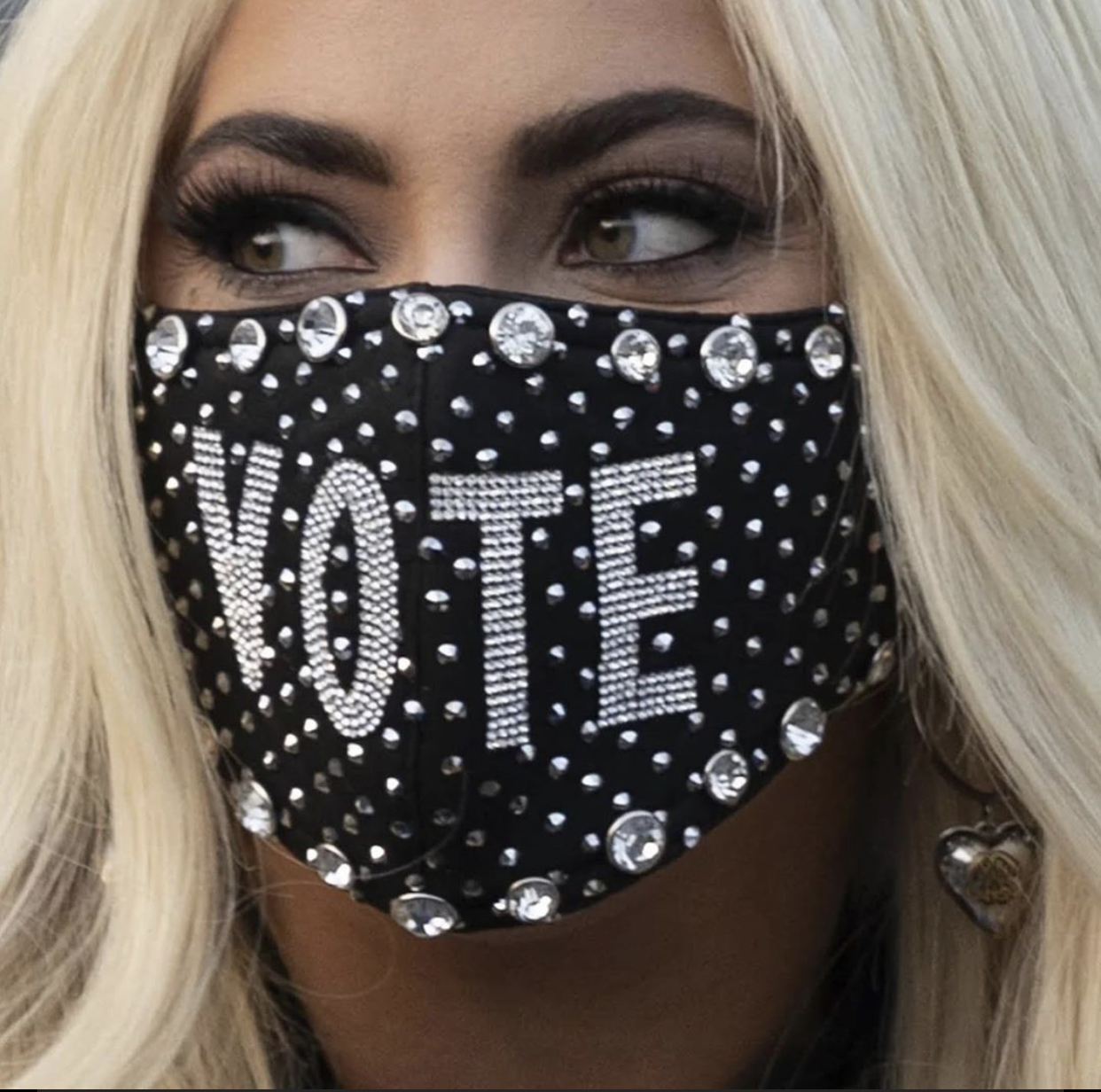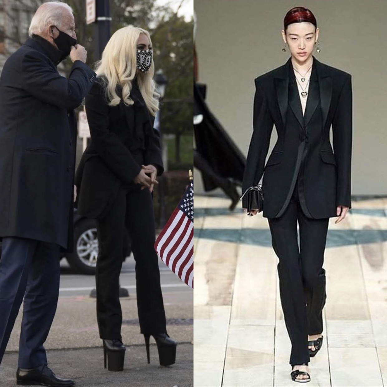Lady Gaga wore an Alexander McQueen FW20 RTW suit paired with a Michael NGO “Vote” triple crystal mask and $91.95 Pleaser USA “X-Treme-102” boots, styled by Sandra Amador and Tom Eerebout. Her makeup was executed by Sarah Tanno-Stewart with hair styled by Frederic Aspiras.