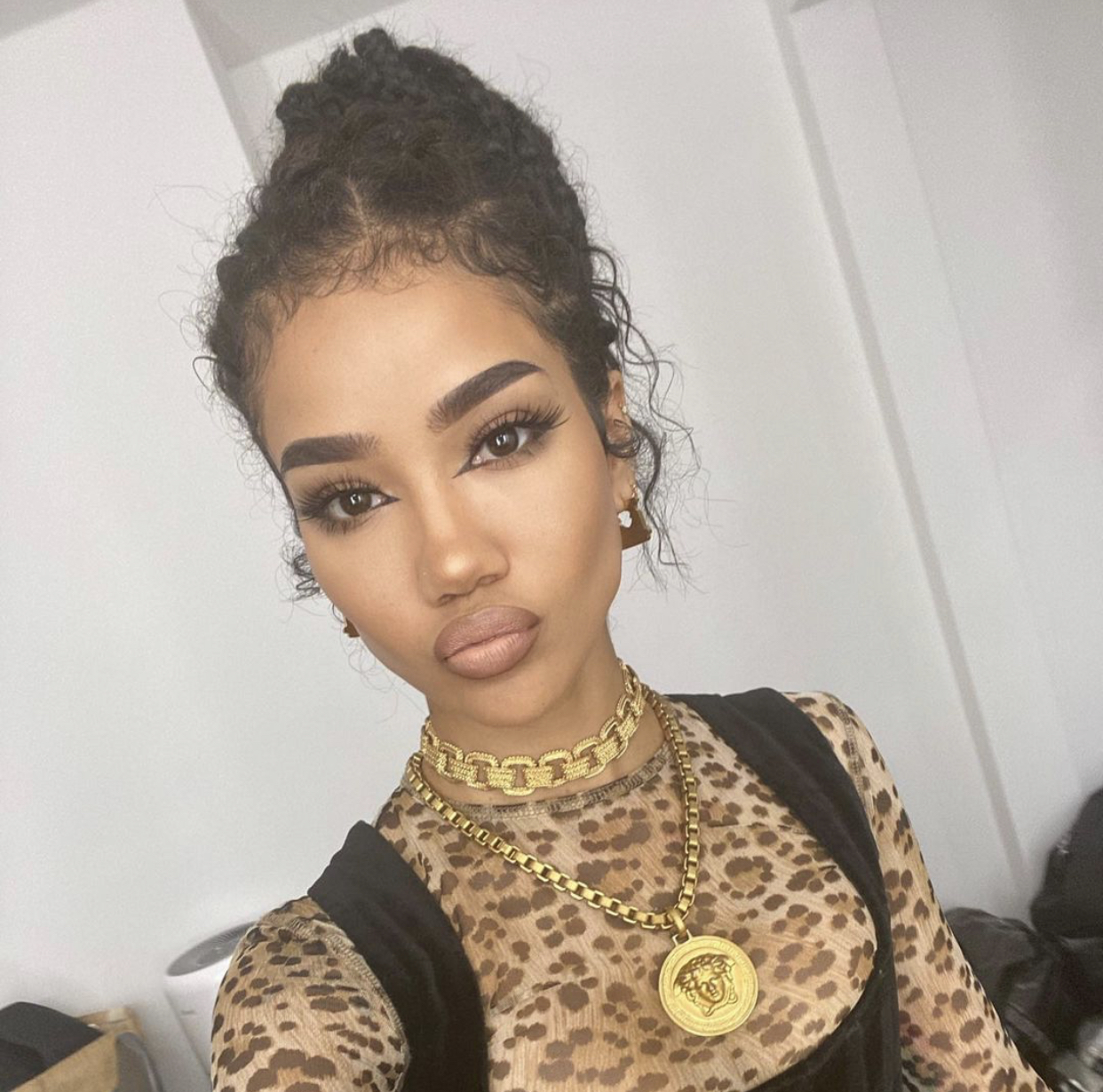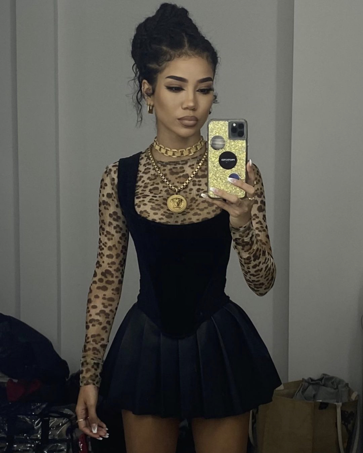 Jhené Aiko posed in Vivienne Westwood mini dress, R13 top, and Versace jewelry! Her look was styled by XS Studio. Her makeup was done by @juanice.mua.