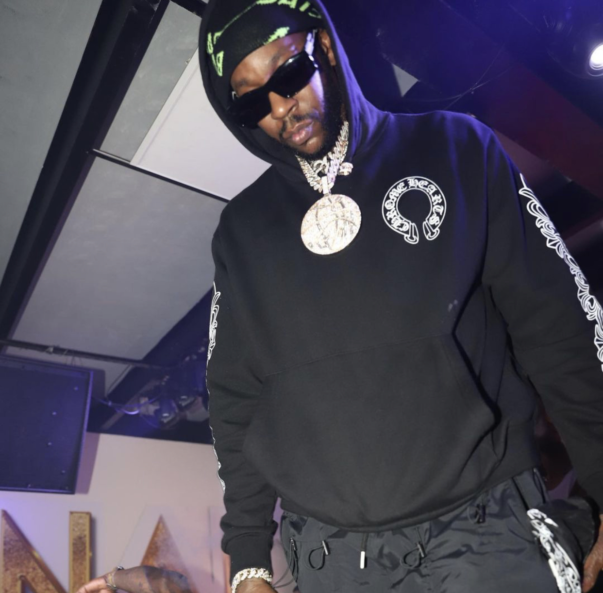 2 Chainz was spotted in a Chrome Hearts hoodie and Balenciaga logo beanie at the “Nae Day” celebration.