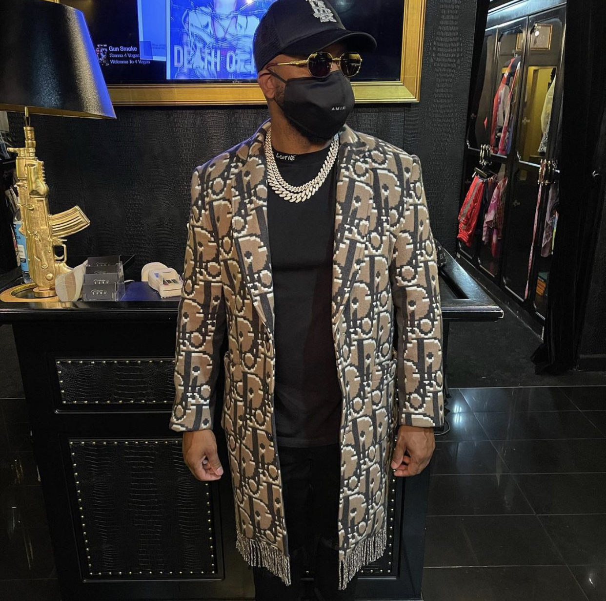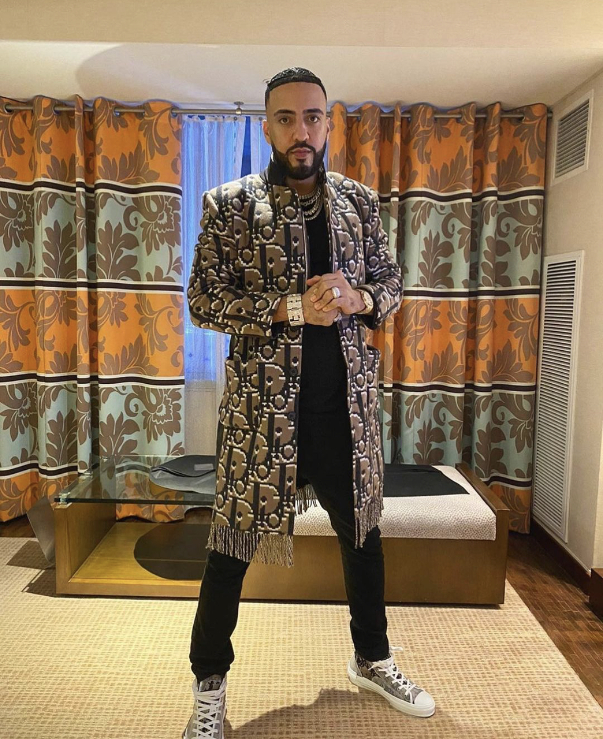 French Montana wore a custom Dior Jacket by Exclusive Game while performing before the Tyson and Jones fight.