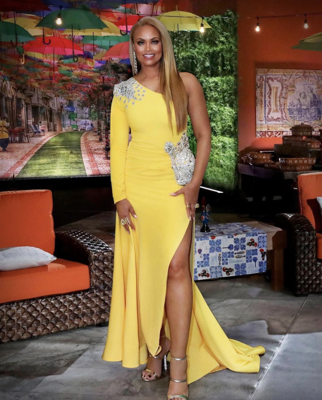 Gizelle Bryant wore a Lisa Nicole Collection by Lisa Cloud gown with Sophia Webster heels.