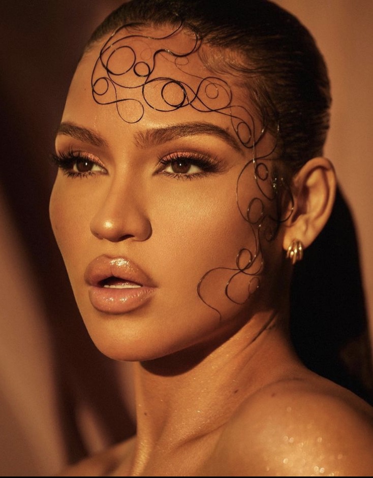 The eye catcher here, besides her new bundle of joy, is Cassie’s hair! Her hair was pulled back into a sleek ponytail but the devil is in the details. Small strands of hair were taken to create an intricate pattern that extended down one side of her face to her chin. Executed by Ruslan Nureev, baby hair has been taken to a new level. Her makeup done by Rokael Lizama.