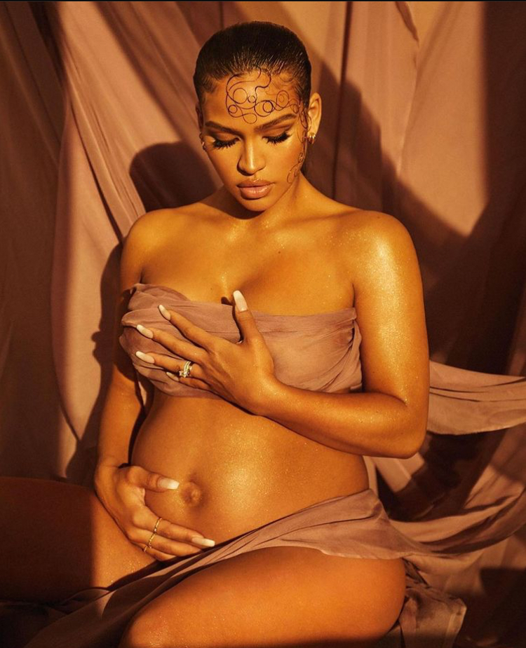 A glowing Cassie took to Instagram to announce and celebrate her latest pregnancy of which she and her husband Alex Fine are expecting their second child. Draped in lush fabrics, Cassie opted for a glamour shot. The earth tones of the fabrics and golden glow of her skin provides a natural regal look.