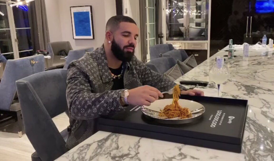 How could we forget the moment with Drake eating spaghetti off his award for receiving a billion streams on Spotify while wearing a Louis Vuitton monogram jacket? Iconic.