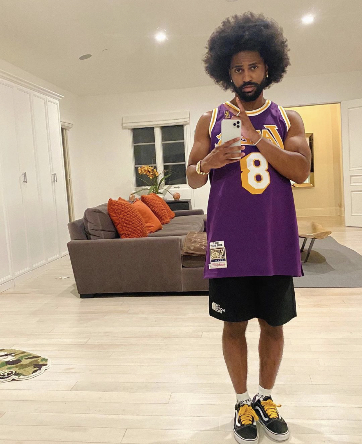 While he enjoys rocking streetwear like graphic tees, jerseys and hoodies, he also dabbles in nice suits and luxe fabrics like velour from time to time. He also enjoys hats like fitted caps, trucker hats, and snapbacks.
