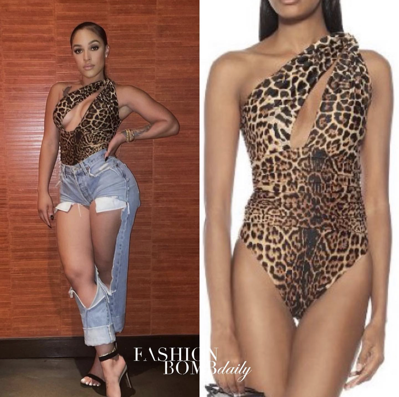 Joie was spotted in $890 Saint Laurent leopard-print one shoulder swimsuit paired with vintage Urban Outfitters jeans (sold out).