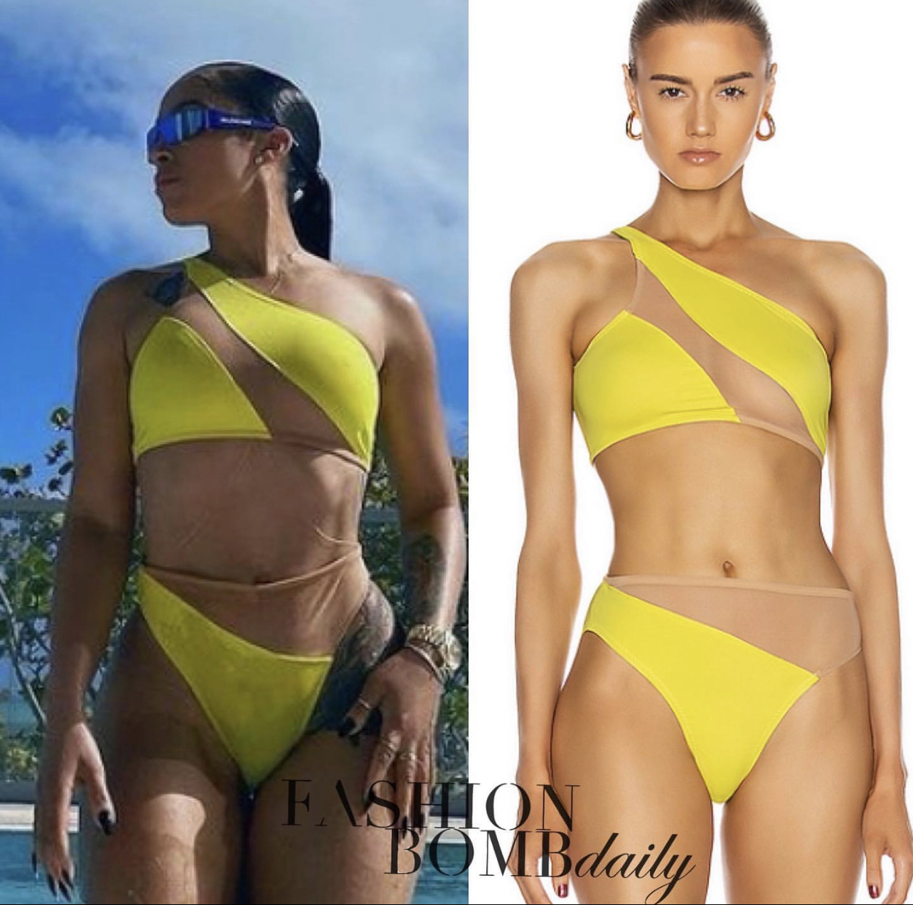 Joie relaxed poolside in a yellow Norma Kamali snake mesh bikini ($135 top and $125 bottoms).