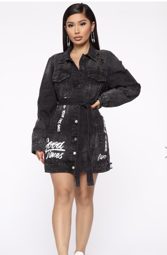 This oversized jean jacket has a tie waist and is available in blue and black, and you can shop this look here.
