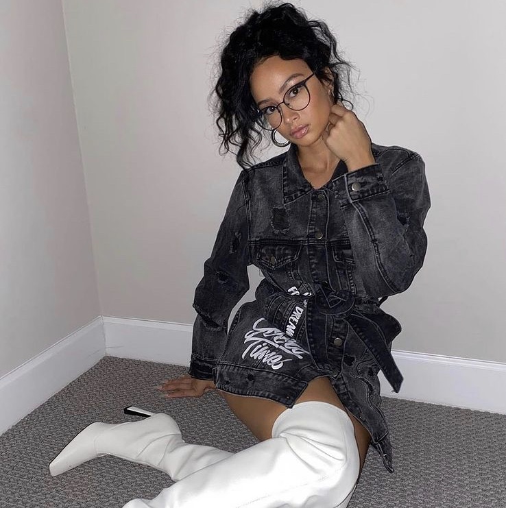 Draya posed for the Gram rocking Fashion Nova’s “Live in the Moment” black denim jacket. With phrases like, ‘Good times’ and “make the right choice’ written on it, you can recite positive affirmations while getting fly! Draya paired the jacket with a pair of white knee high boots.
