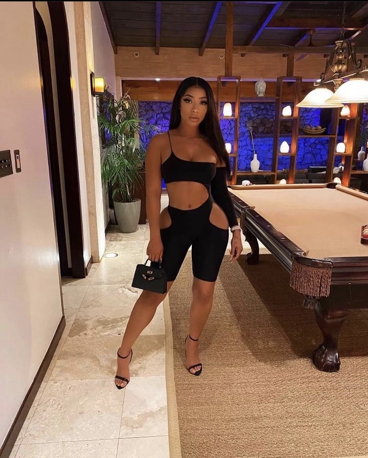 Tommie posed on Instagram wearing Fashion Nova’s $44.99 “Want That Goodie” cut out romper. The biker short romper has cut outs at the hip and and midriff which will be sure to accentuate your curves and show your physique.