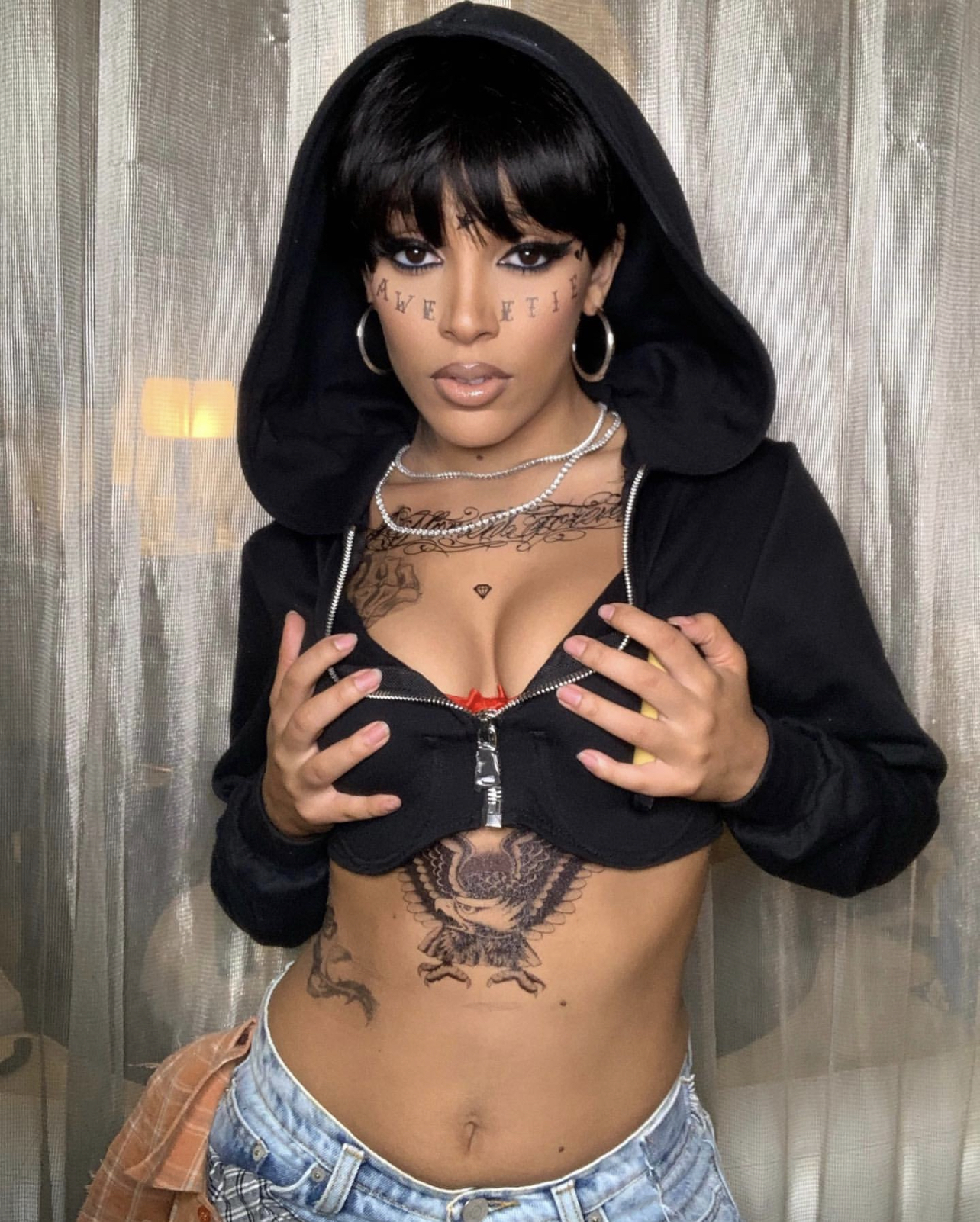 Doja Cat posed in a cutout mesh custom set by Laroxx.