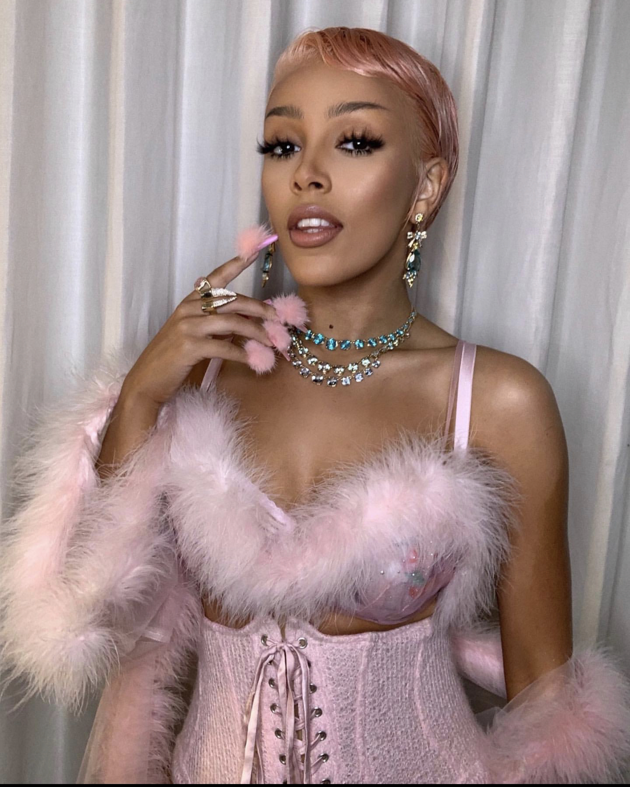 Doja Cat’s glam including styling by Brett Alan Nelson, hair by JStayReady, makeup by Adam Burrell, and nails by @sacciadidthat.