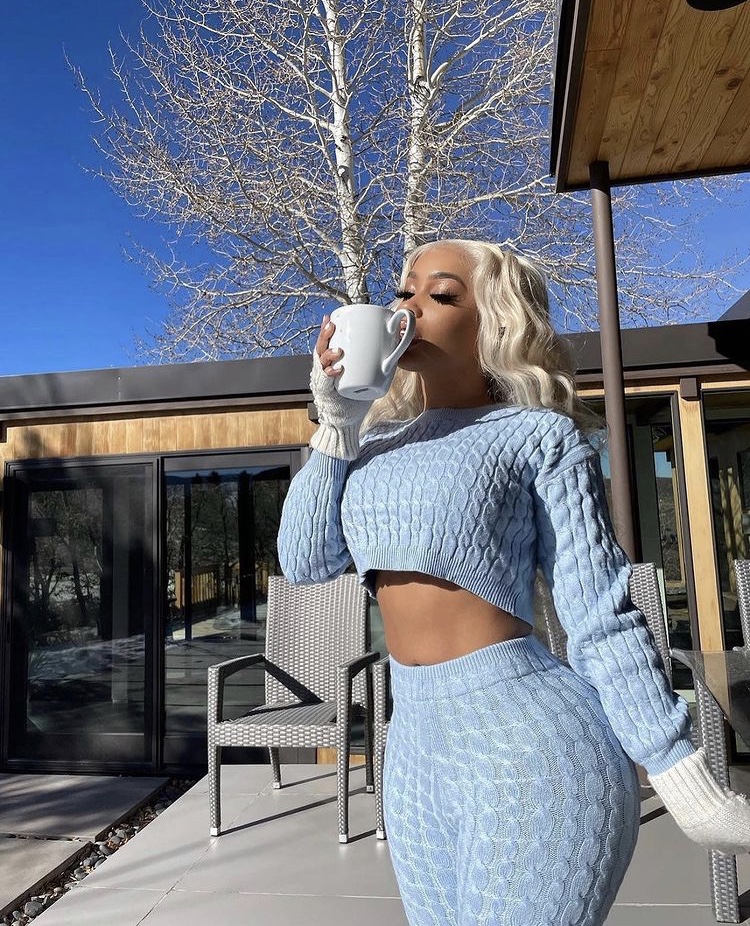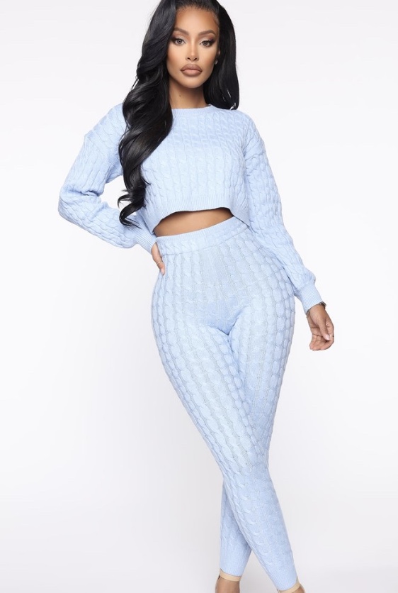Dream Doll posed wearing Fashion Nova’s “Sweater Sweetie’ pants set in light blue. This cable knitted set is perfect for a cozy cabin get away, providing warmth and comfort without sacrificing style. The top is a pullover crop sweater and the leggings are high waisted with and elastic band.