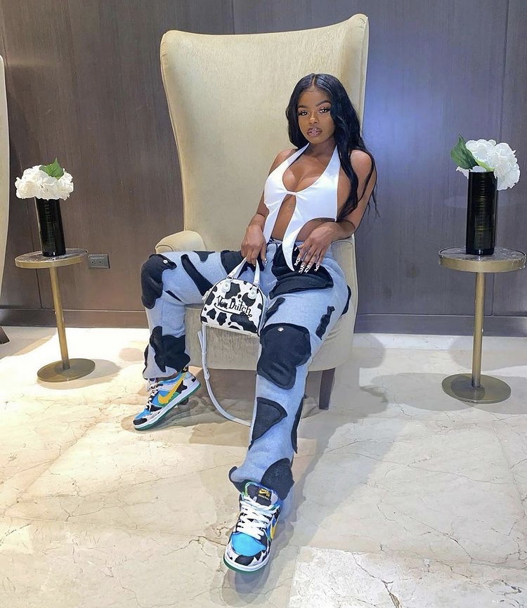 She served ‘sporty glam’ pairing the top with blue cow print joggers, Nike SB “Ben and Jerry’s Chunky Dunky” sneakers and a Von Dutch cow print bowling bag.