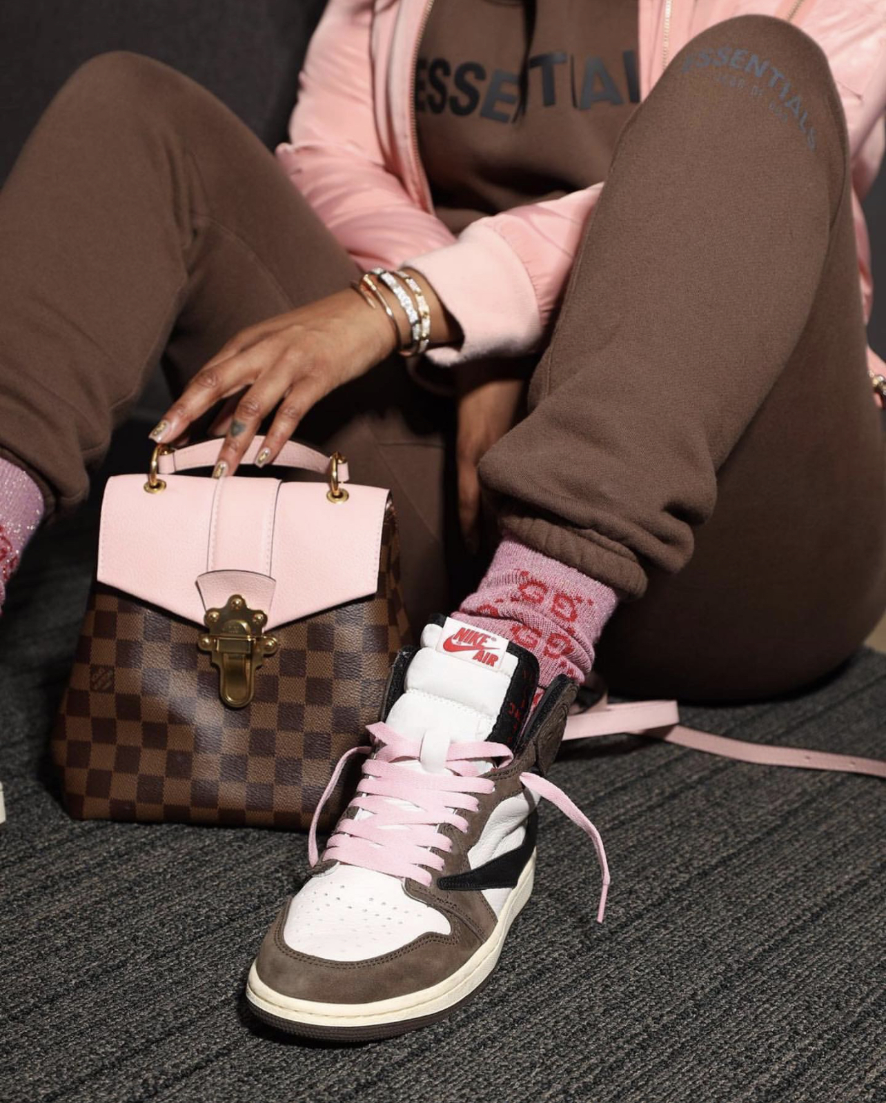 Karen Civil wore a brown Essentials by Fear of God logo hoodie and sweatpants ($100 and $90, respectively) paired with a $2,210 Louis Vuitton Clapton Backpack Ebène Damier, Travis Scott x Air Jordan 1 sneakers and $185 Gucci “GG” Lamé socks. Her look was styled by @ohh.roman with hair by @iam_whatshername_ and makeup by Stephanie Nimoh.