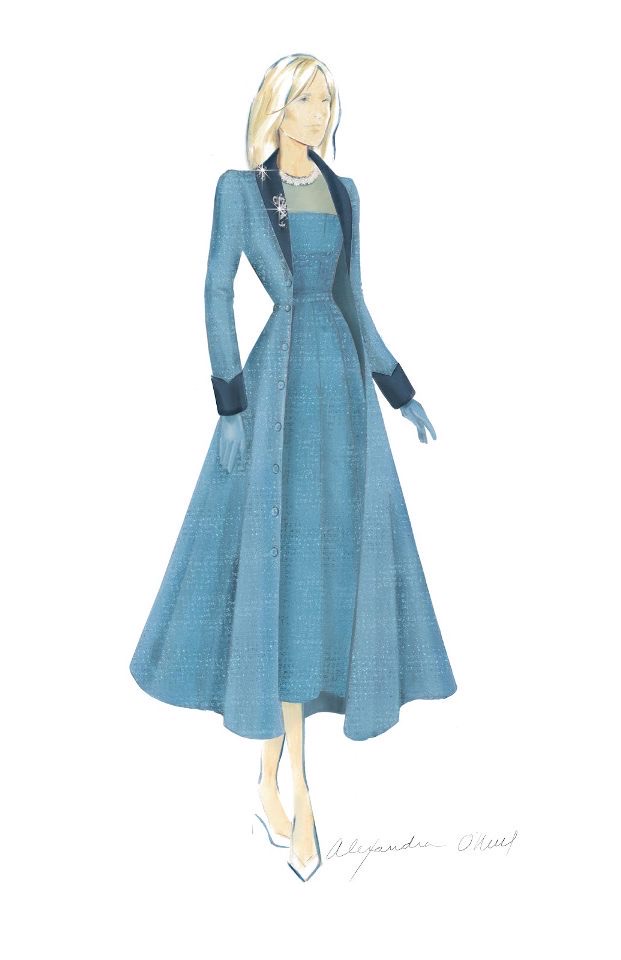 The coat, with its dark blue velvet collar and cuffs, is worn over a tapered dress with a chiffon bodice and scalloped skirt. The neckline of the dress is hand embellished with Swarovski pearls and crystals in a delicate floral pattern. The same Swarovski crystals adorn the coat and dress, subtly reflecting the light. The color blue was chosen for the pieces to signify trust, confidence, and stability.