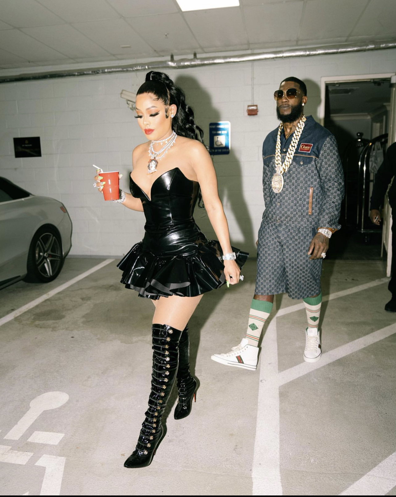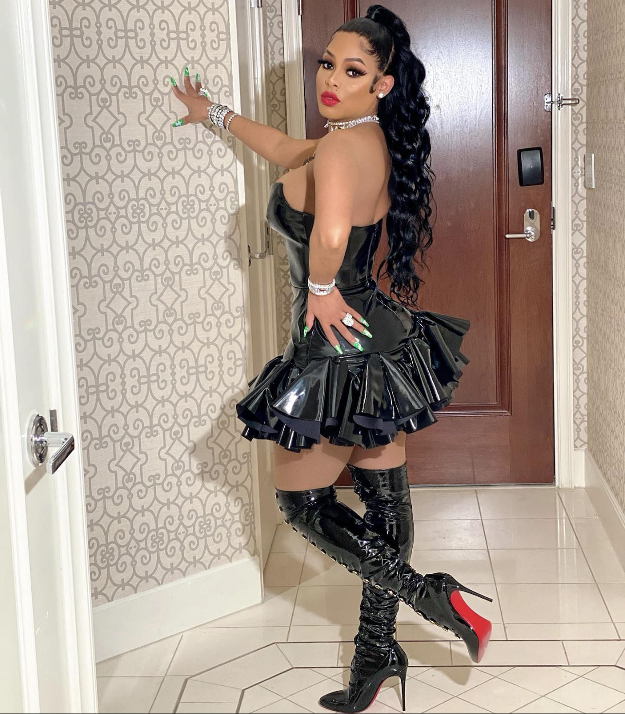 Keyshia Ka’oir was spotted out with her husband Gucci rocking the Giuseppe Di Morabito dress with layered icy jewelry and Christian Louboutin Frenchissma Over-The-Knee Patent Leather Boot (sold out, but shop a similar pair here). She also went with a red lip from her KA’OIR Cosmetics brand for a pop of color!