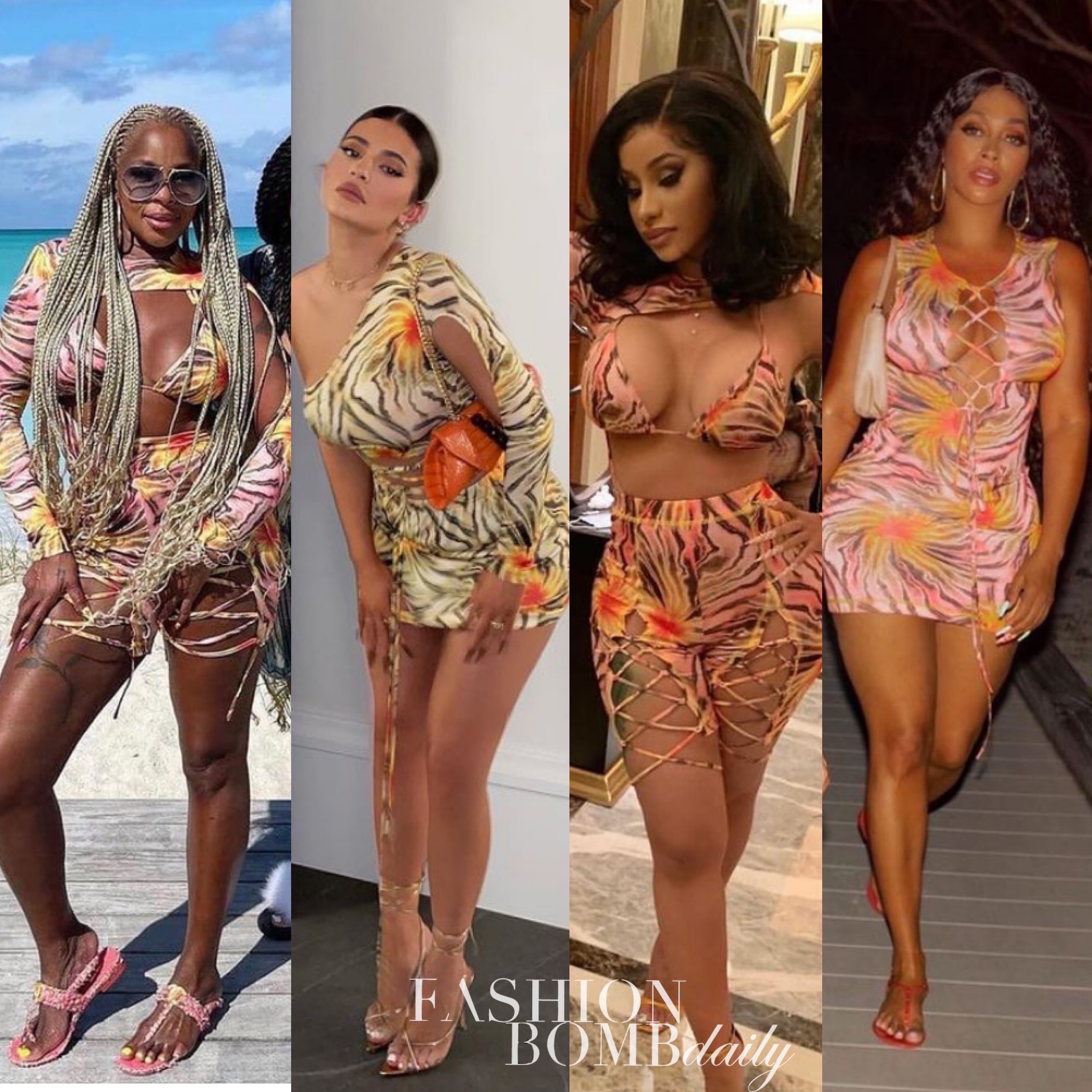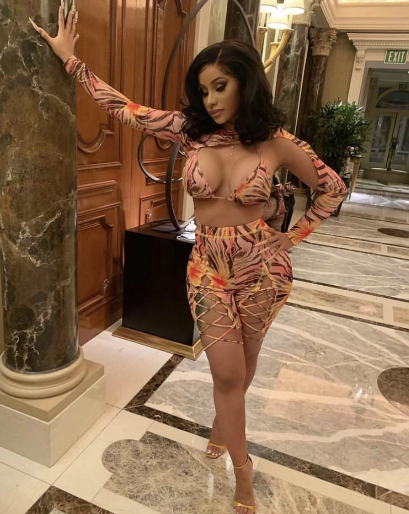 Cardi B was one of the first to wear the cut out print top and matching short with gold sandals.