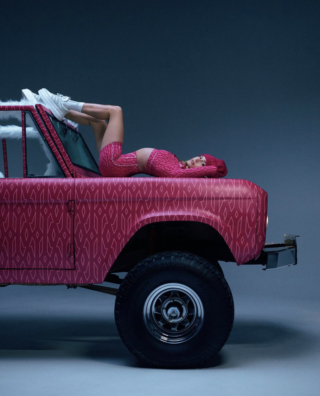 Beyoncé was spotted in the IVY PARK x adidas “ICY Park” campaign rocking a pink monogrammed two piece set which featured leggings and a long-sleeve crop top.