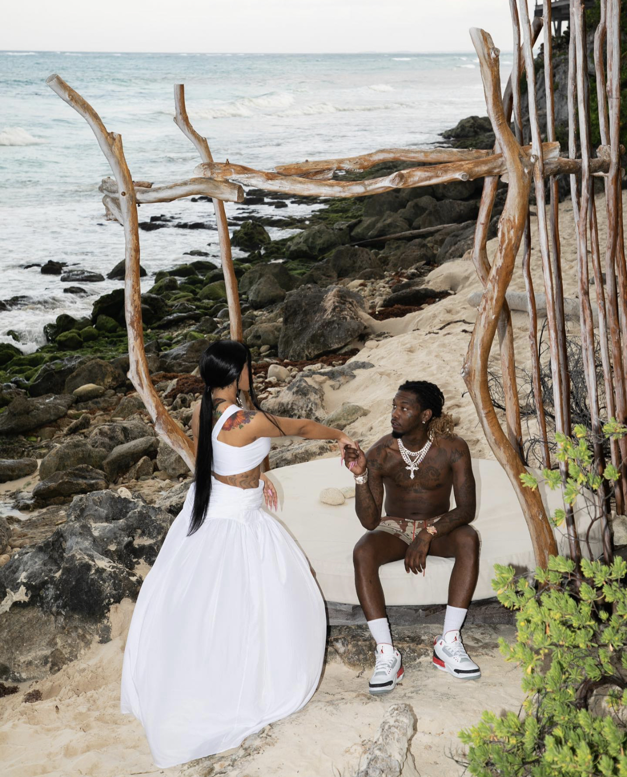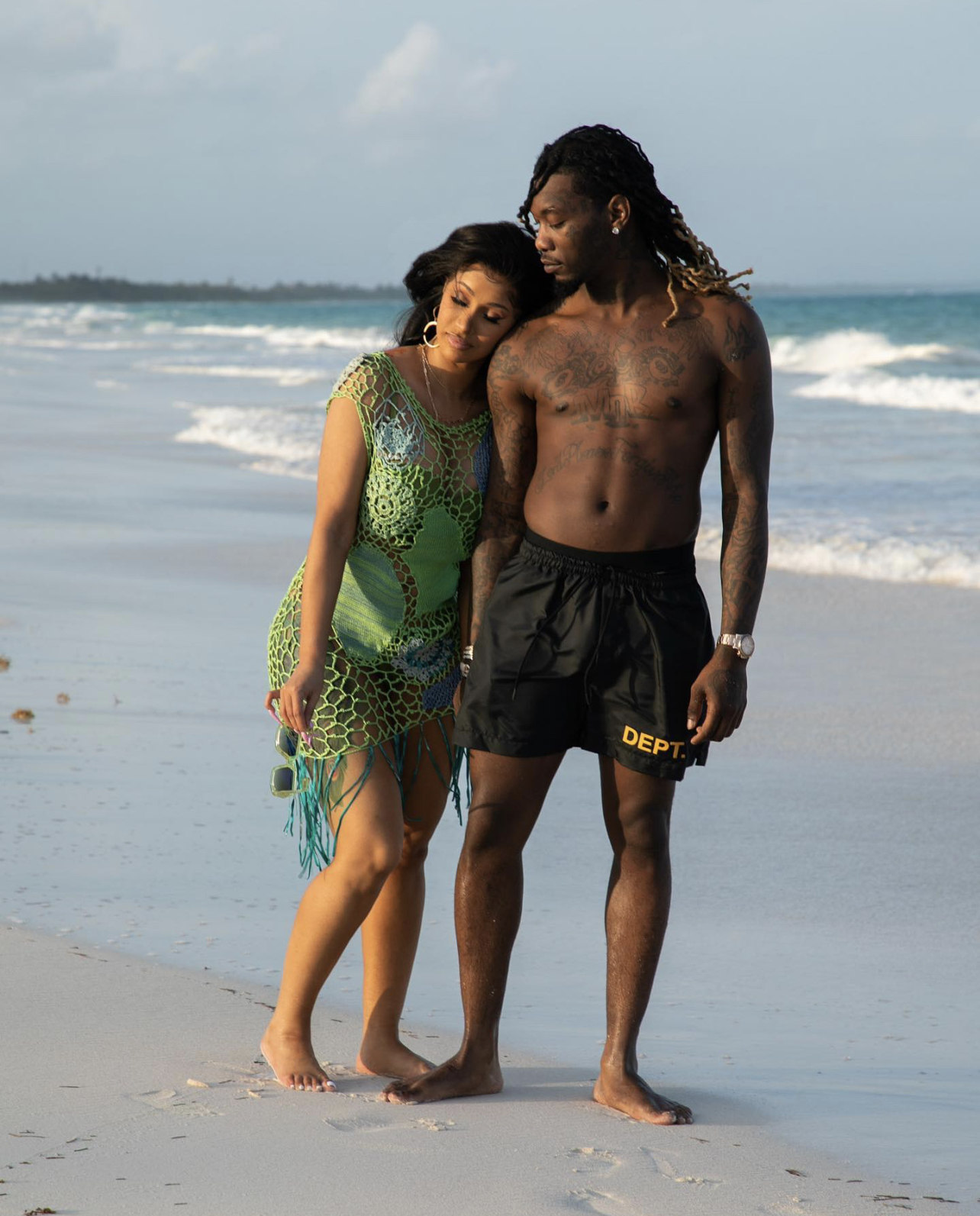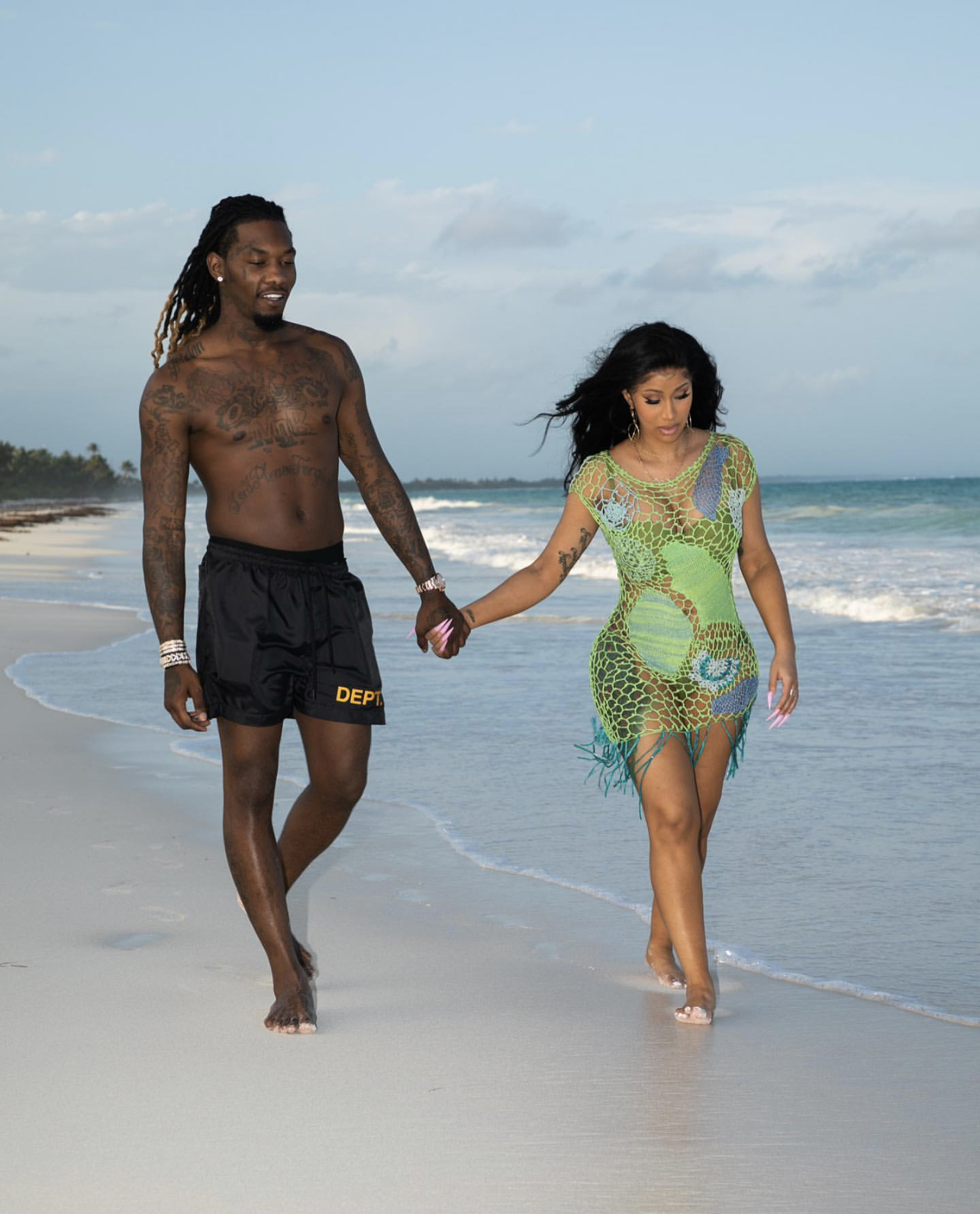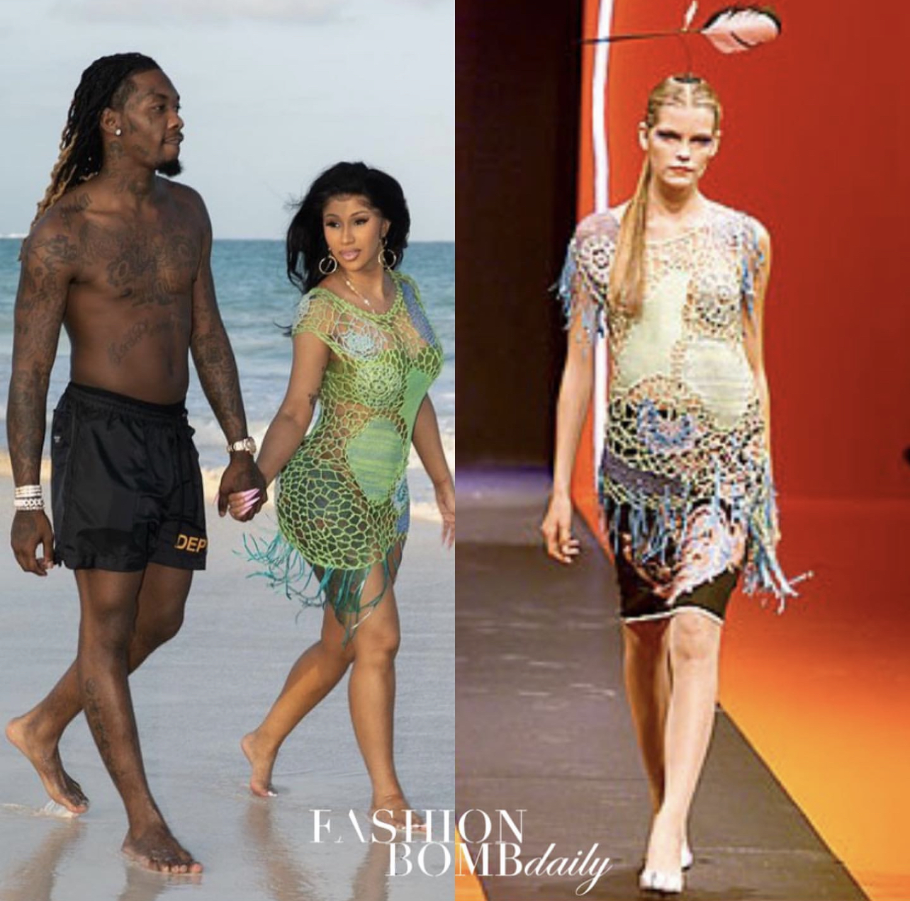 Cardi B took a romantic walk on the beach with husband Offset in a vintage Christian Lacroix crochet knit coverup for the brand’s Spring 2000 collection.