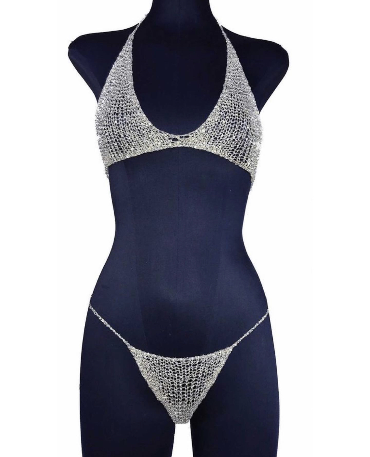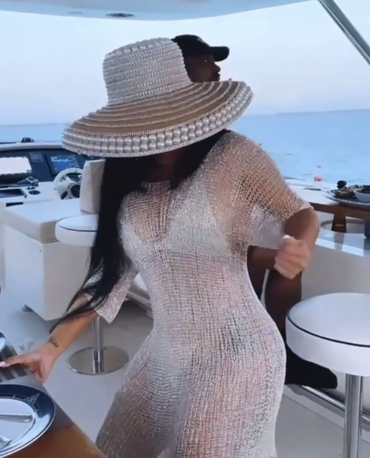Cardi B wore a Natalia Fedner silver knit set which included a chain bikini ($2,635.50 bikini top and $1,242.75 chain thong) and chain t-shirt dress. The bikini is available on the Natalia Fedner website, but you have to email the brand for interest in the dress. She completed the look with a Saint Fort Brand “The Derby” hat (sold out).