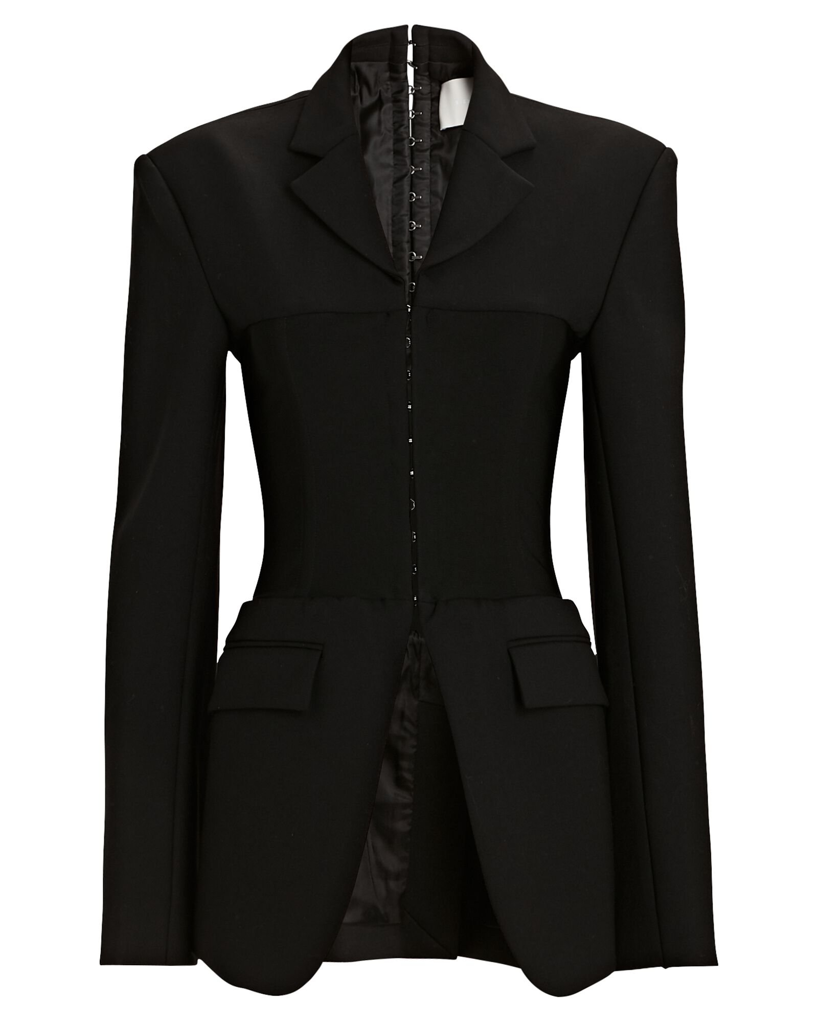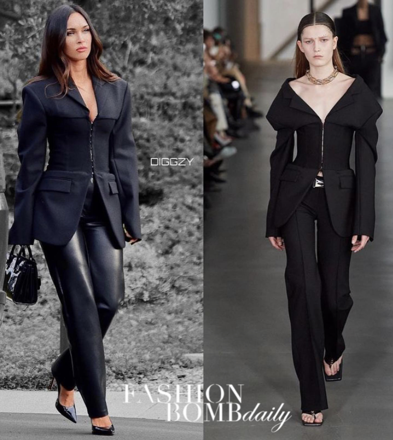 Megan Fox wore a $1,390 Dion Lee Tube wool blazer jacket, $148 Aritzia “Wilfred Melina” pants (sold out), $98 Schutz ‘Caiolea’ Pumps and $2,290 Saint Laurent Mini Sac de Jour Patent Leather Satchel. Her look was styled by Maeve Reilly.