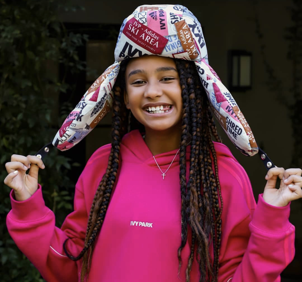 Her daughter wore the collection’s kid version of the $95 pink cargo hoodie (sold out) and matching $110 cargo pink sweat pants accessorized with the $30 cut-off logo beanie (sold out), pink monogram face mask, and $150 Forum Mid shoes. She also wore the ski tag allover print trapper hat (exclusive to her, not available for purchase).