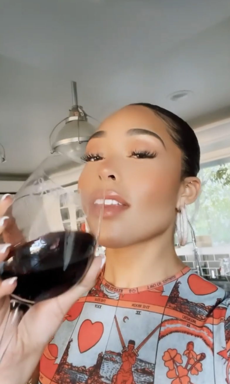 Jordyn Woods showed off a delicious (!) looking charcuterie board wearing a top from a brand called Miaou.
