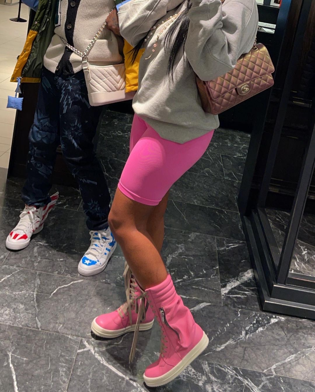Yep! JT stepped out for a shopping day with Lil Uzi Vert in a Helmut Lang Sweater, Chanel Bag, and $1,540 Rick Owens Pink Pocket Sneakers: