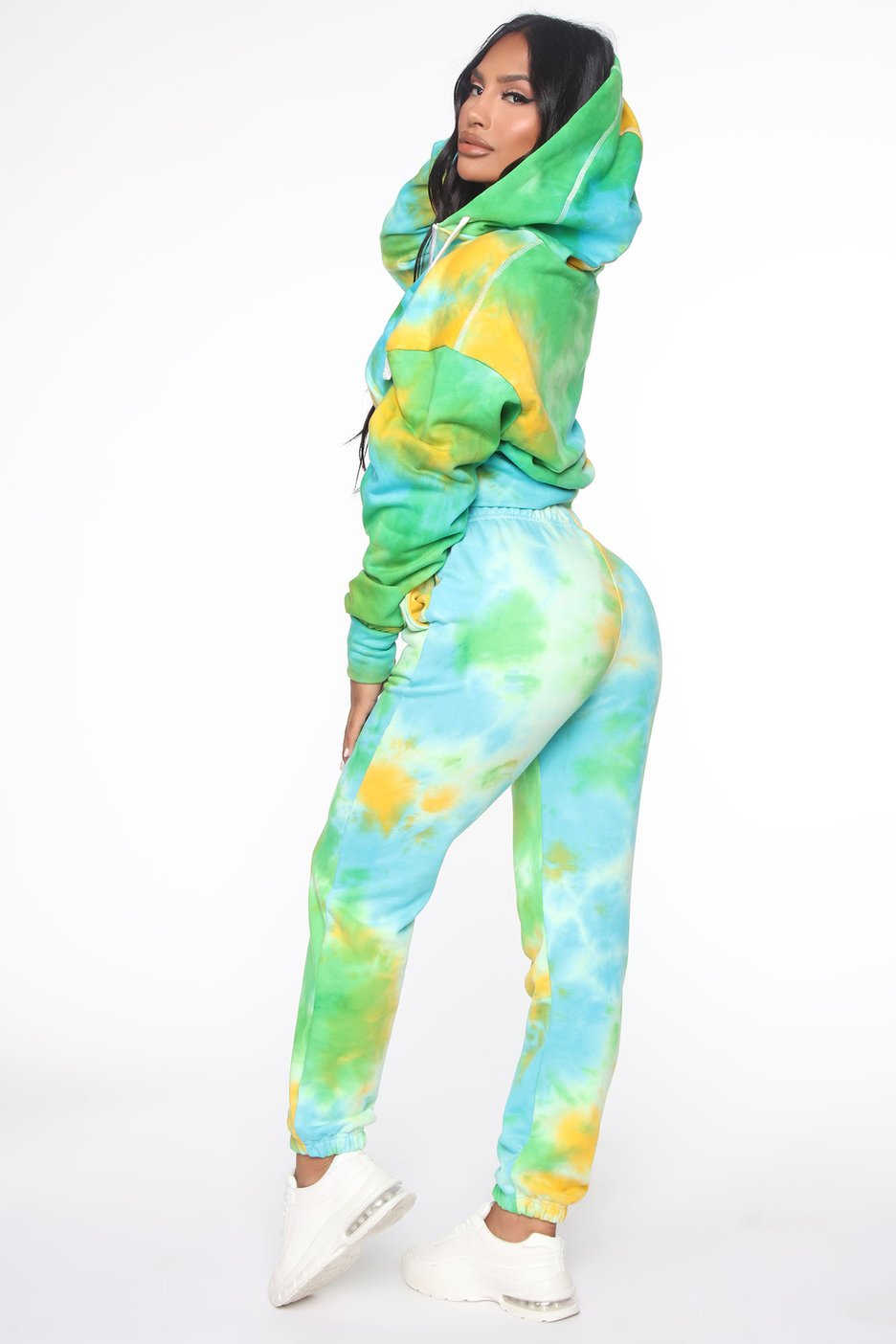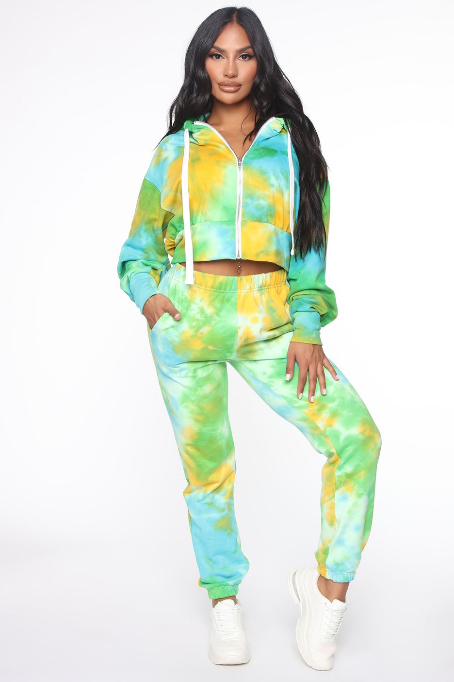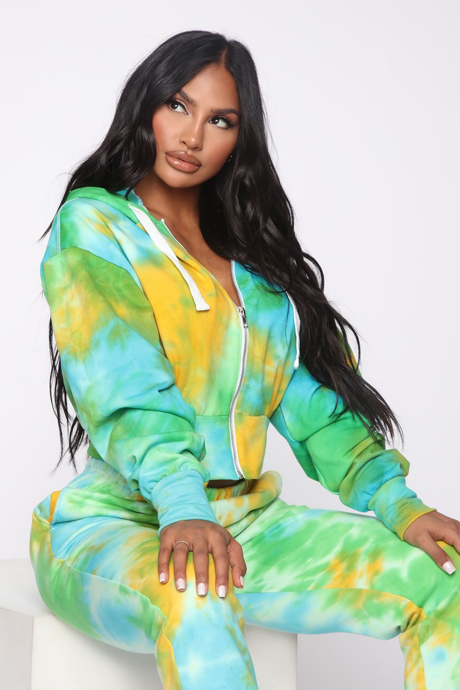 Bernice Burgos wore Fashion Nova’s $22.99 Yoga and Chill Joggers which come in a blue, green and yellow tie-dye color. For the look, Burgos decided to rock the joggers with a white bralette and minimal gold jewelry including a ring set and gold chain anklet.
