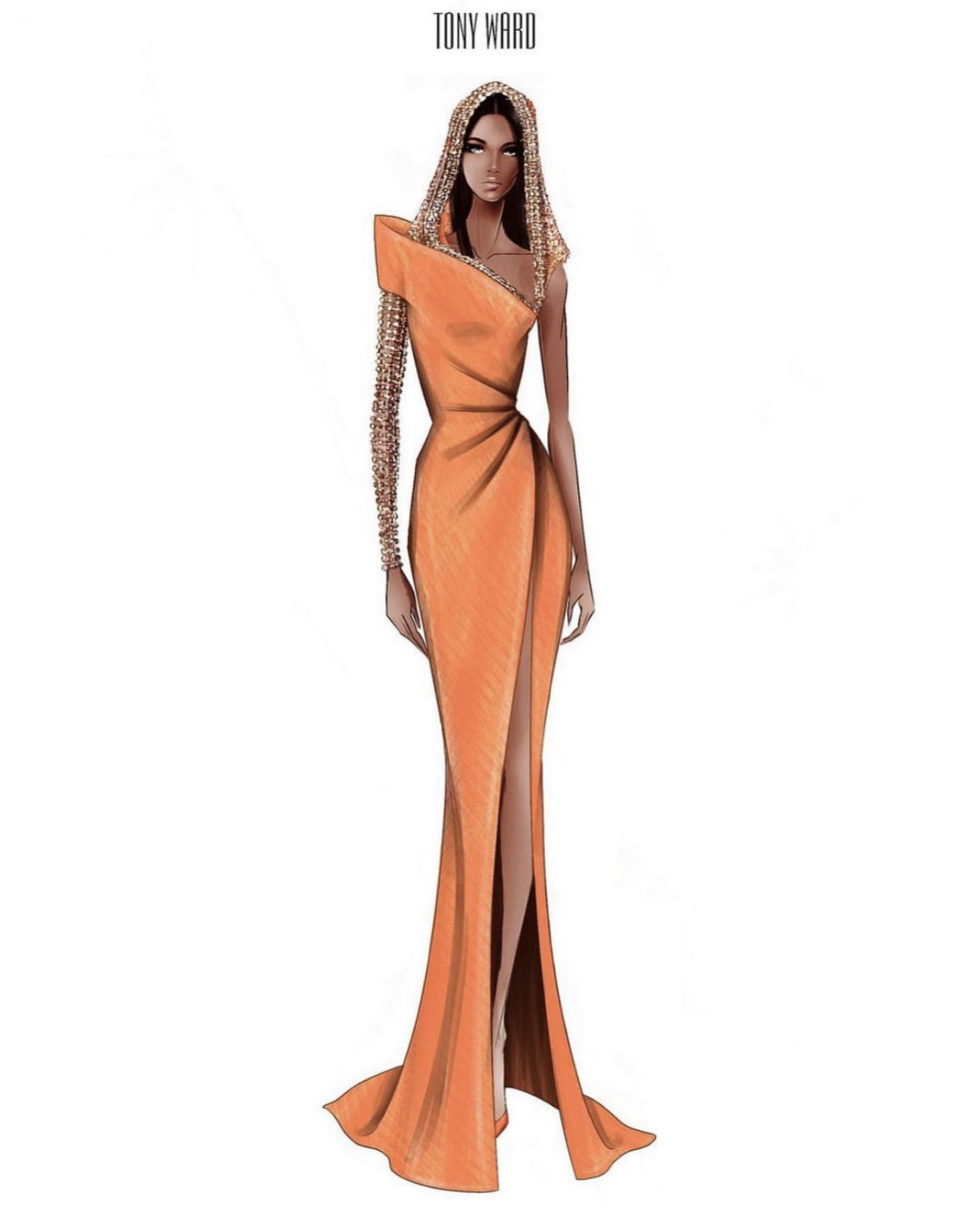 Nomzamo Mbatha wore Tony Ward Couture Spring/Summer 2021. Her dress featured a draped tangerine detailing along with an intricate crystal sleeve and detachable hood. She also wore Jimmy Choo “Shiloh” crystal sandals (sold out). For accessories, she went with Mahrukh Akuly earrings and Noa Jewelry rings.