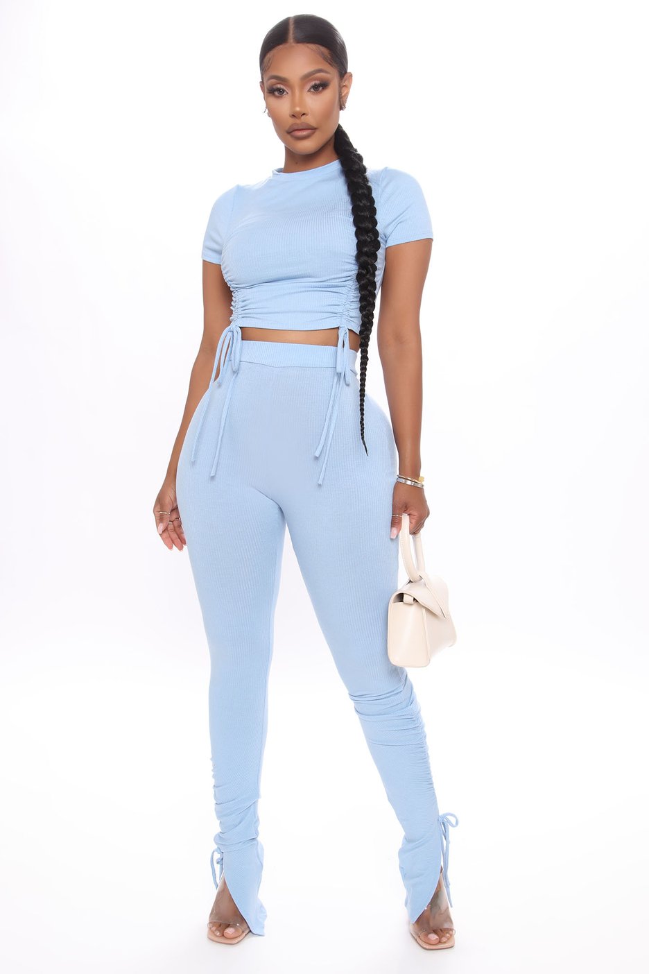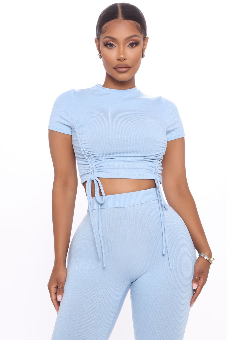 The Clear Your Schedule Ruched Pant Set features a ribbed drawstring top and ruched split-hem pants. The set also comes in black and brown.