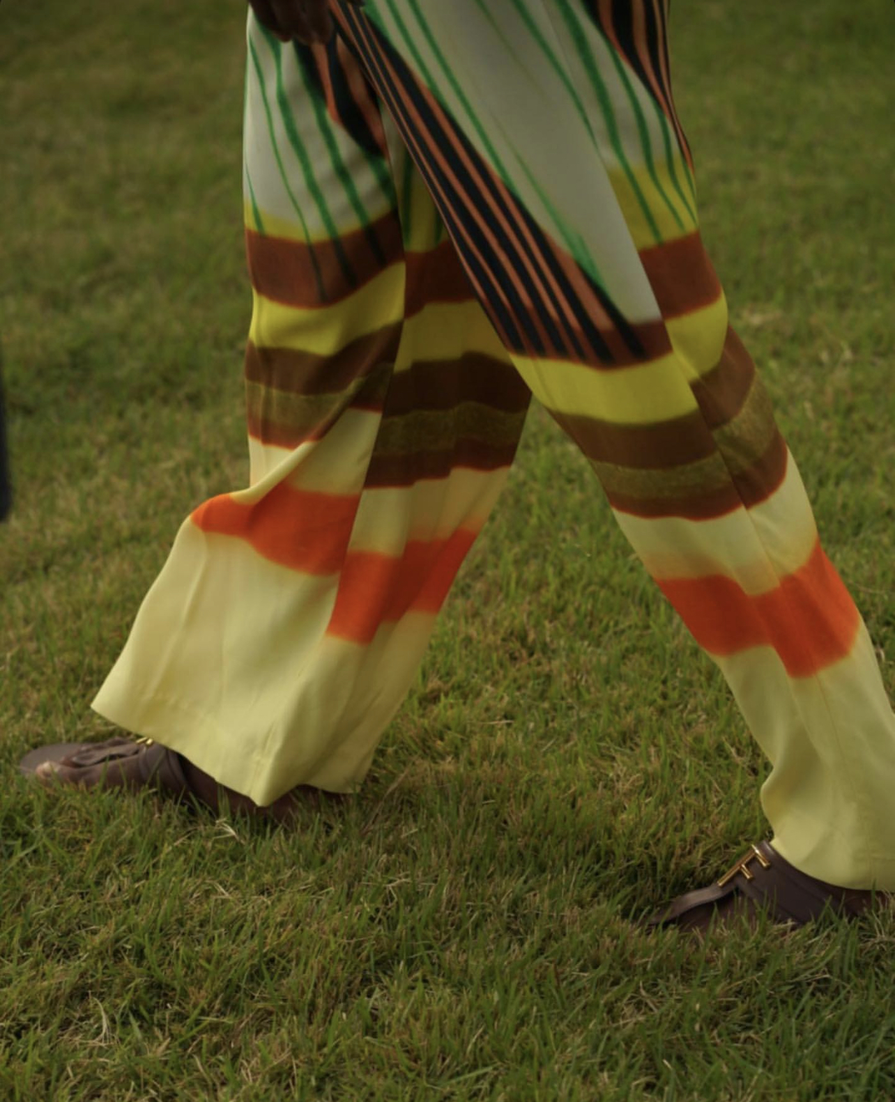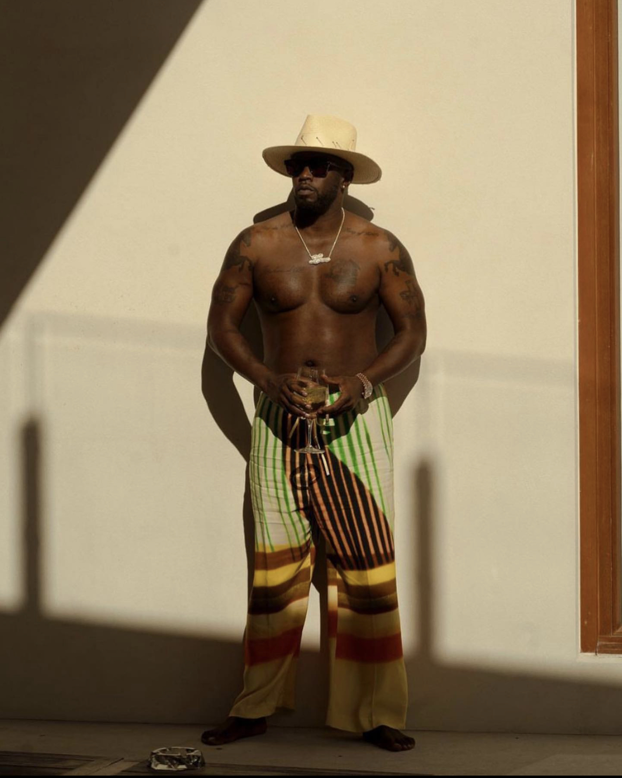 Of course! Diddy was getting in some vacay time in the Bahamas wearing Dries Van Noten multicolor striped pants. The pants appear in a similar print to the brand’s Spring 2021 collection, so they may available soon on driesvannoten.com and other stockists as we approach the upcoming Spring/Summer season. He accessorized the pants with a $675 straw hat from Nick Fouquet.