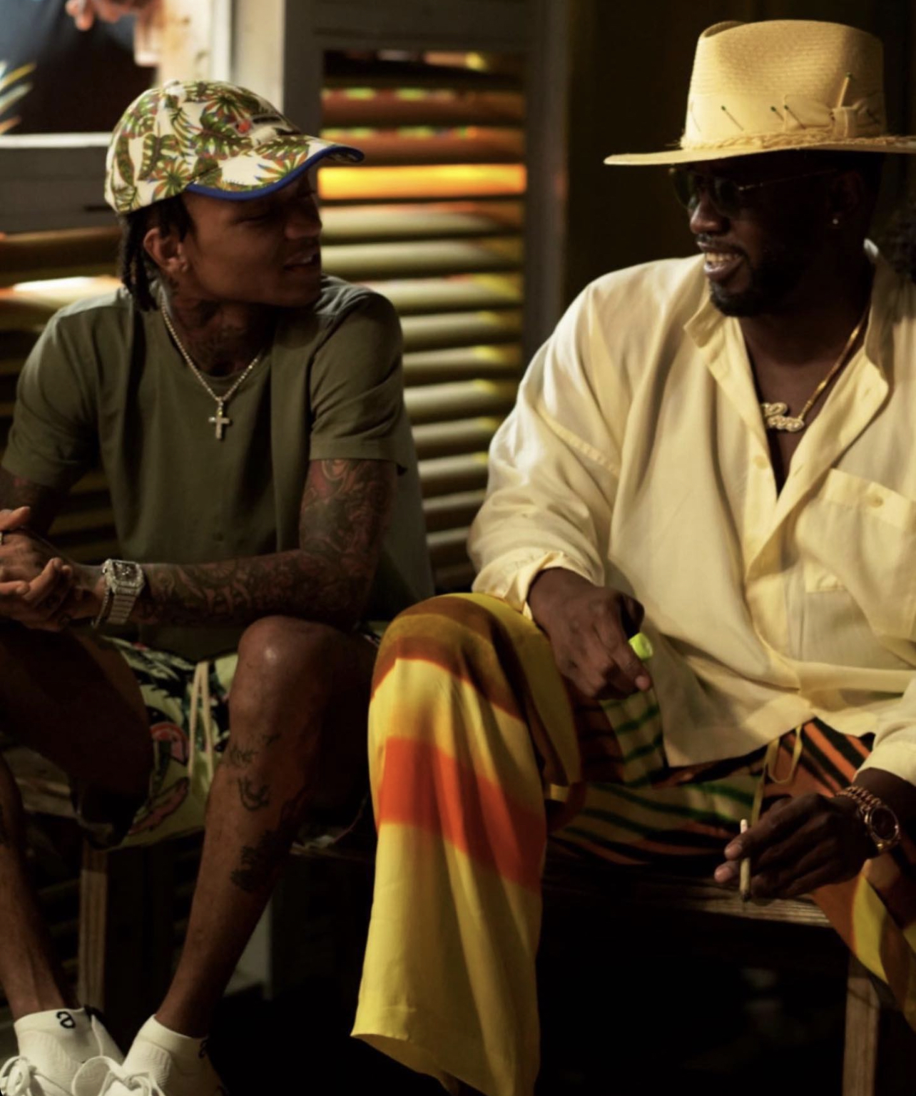 In another picture featuring the pants, Diddy chatted with rapper Swae Lee wearing an Issey Miyake ivory button chest pocket top and $1,012 brown Tom Ford logo thong sandals.