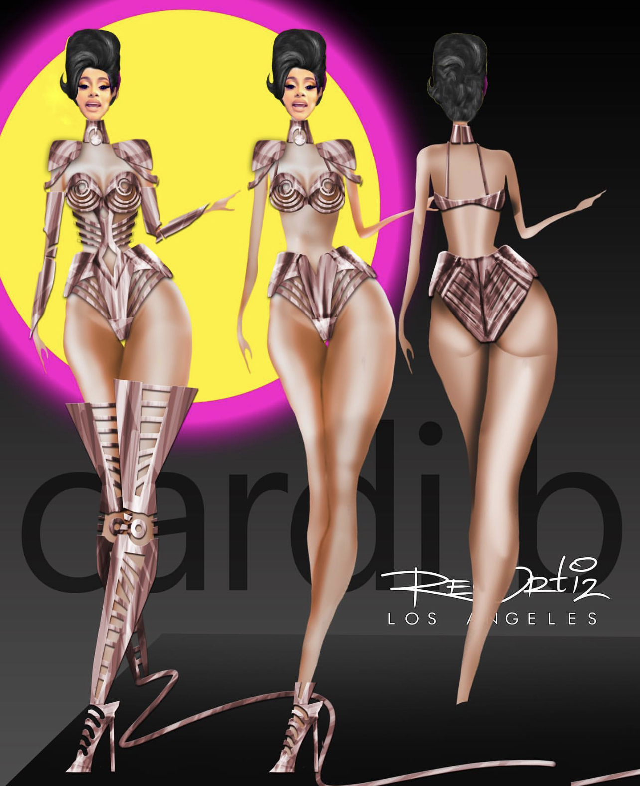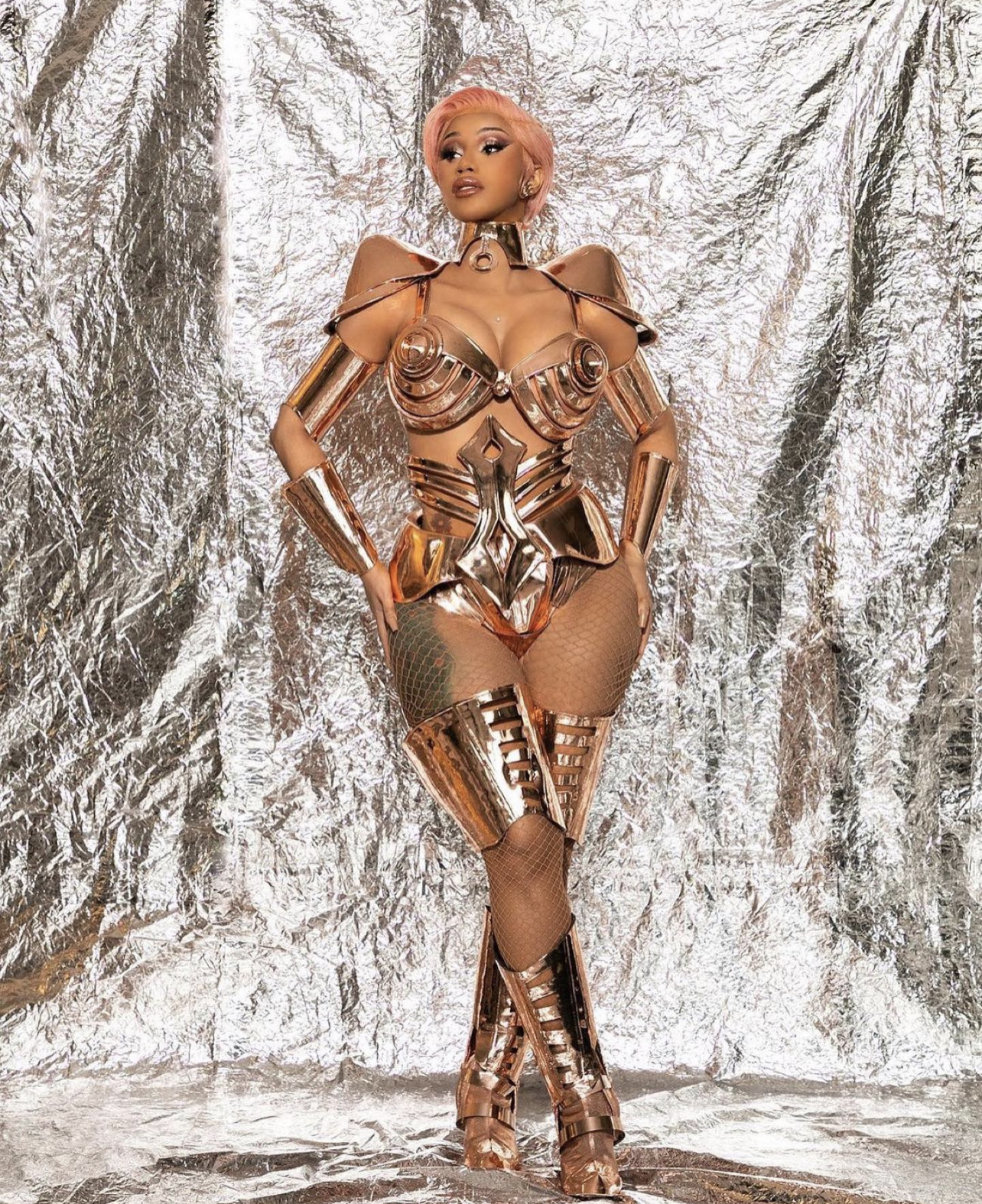 Cardi B performed at the 2021 Grammys rocking a look by Rey Ortiz, styled by Kollin Carter and assisted by Aaron “AC” Christmon and Reva Bhatt. Around the holidays last year, Kollin Carter reach out to Ortiz with a challenge of creating a metal look for the Grammys that had to be “fully danceable, sexy and comfortable”. Ortiz gladly accepted the challenge, quickly drawing up a sketch that ultimately sold Carter.