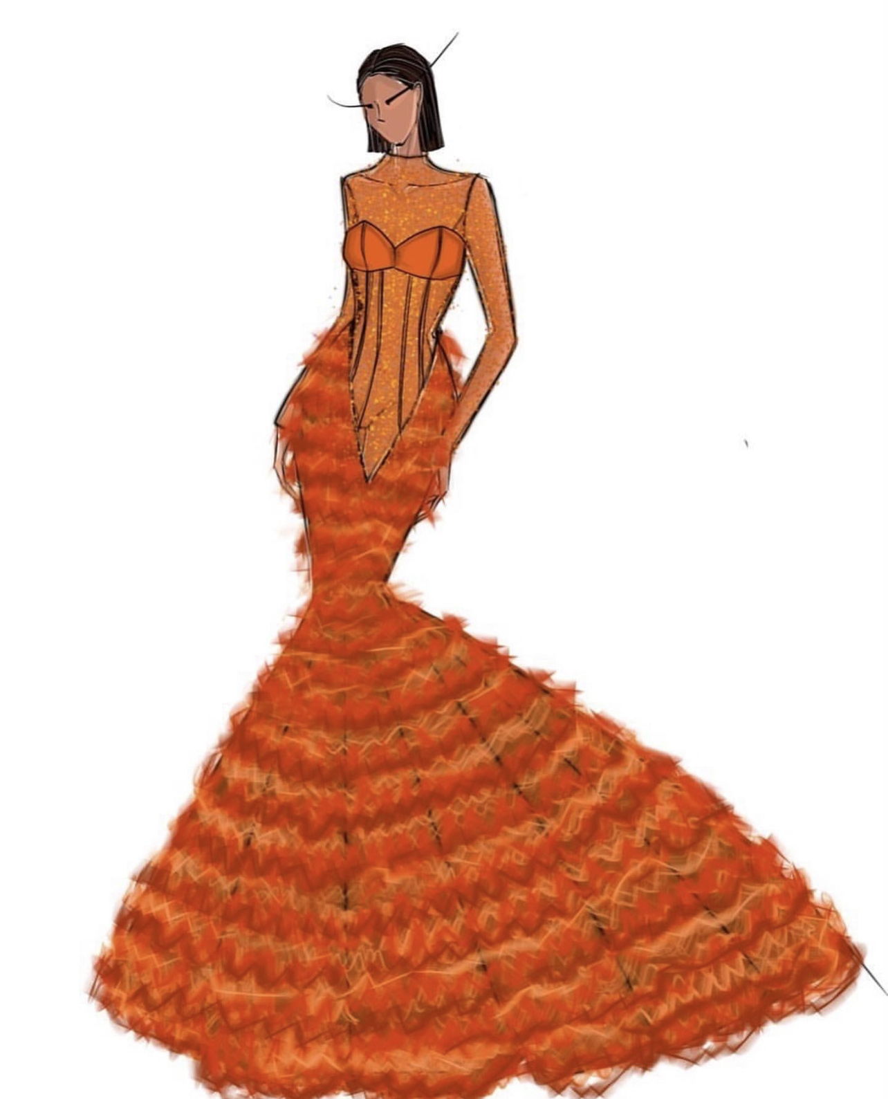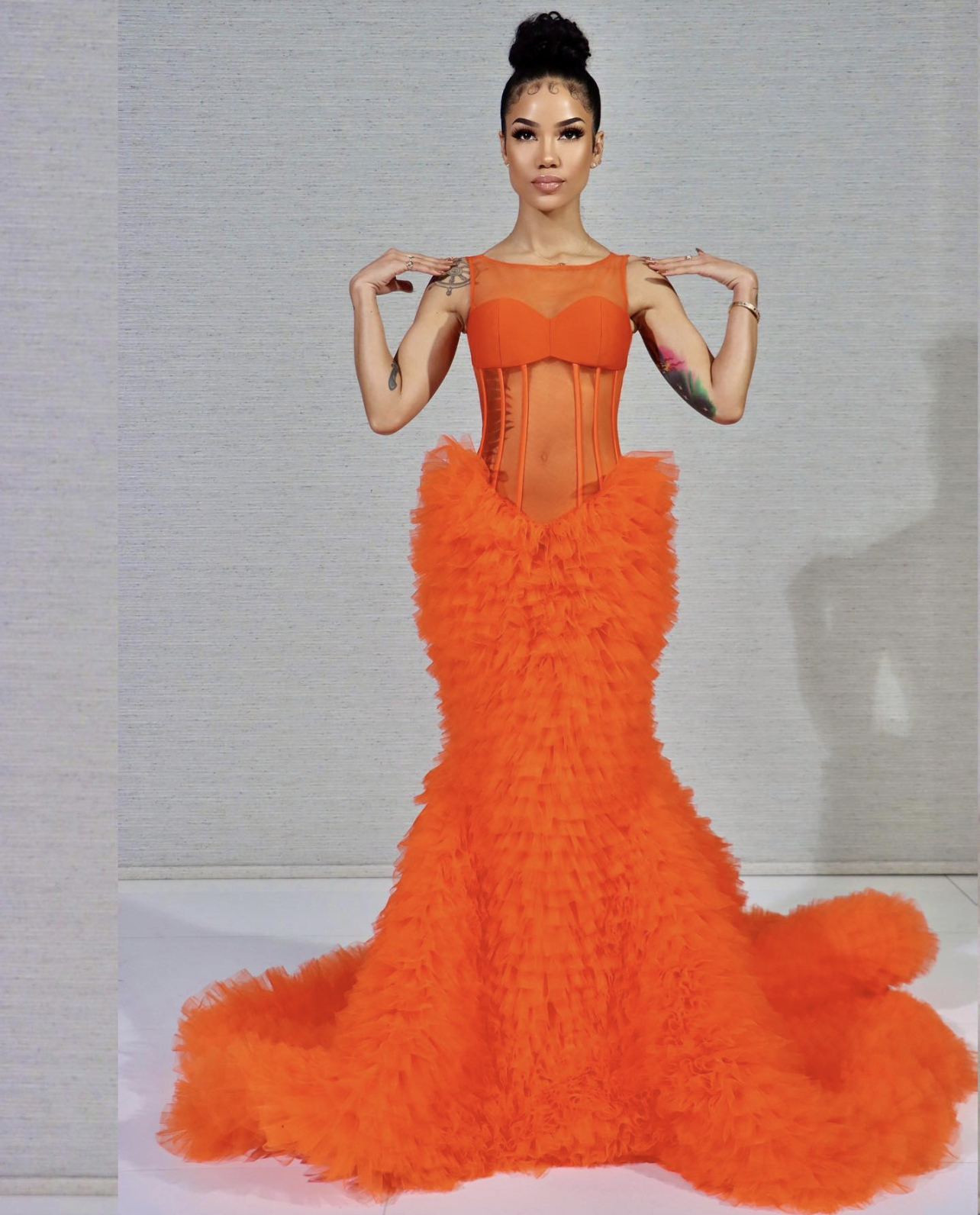 Jhene Aiko wore a Jovana Louis by Jovana Benoit Louis custom dress which consisted of orange tulle throughout the gown. She accessorized the look with jewelry by Sydney Evan. Her look was styled by Icon Billingsley with her makeup by Juanice and hair by Michelle Richardson.