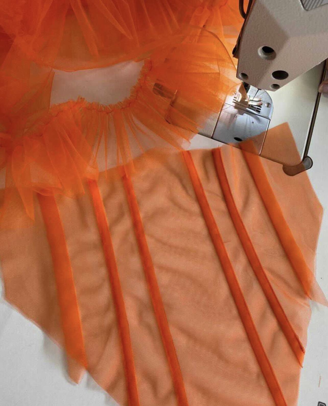Her dress appears with a structured sleeveless top complete with a poofy floor length bottom portion which resembles a feather-like design.