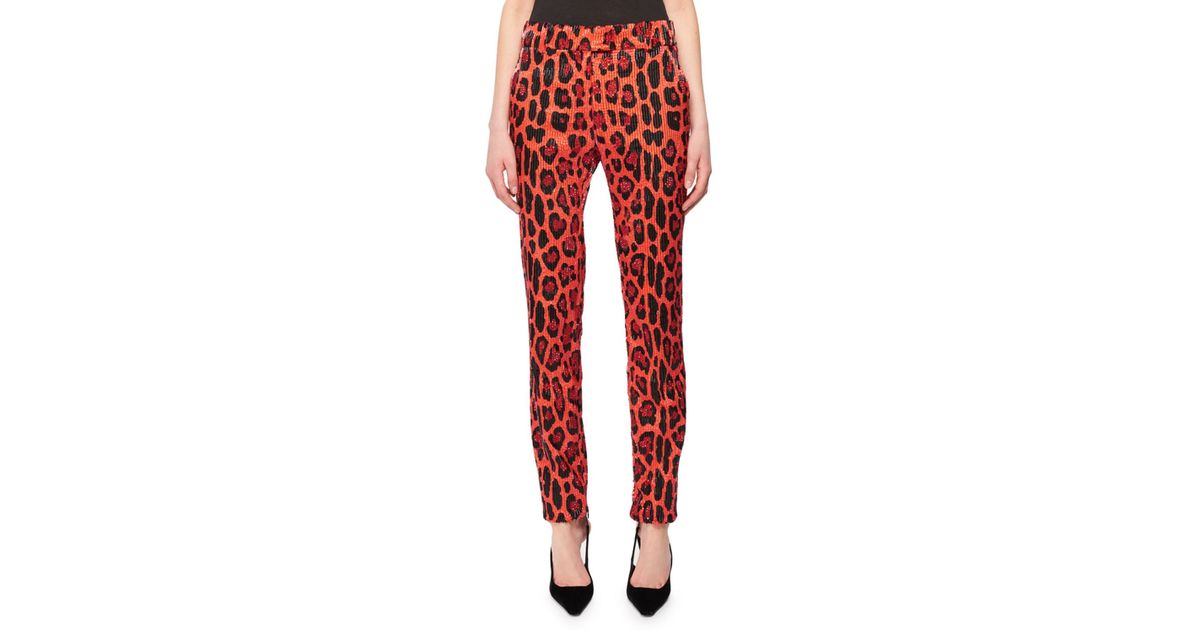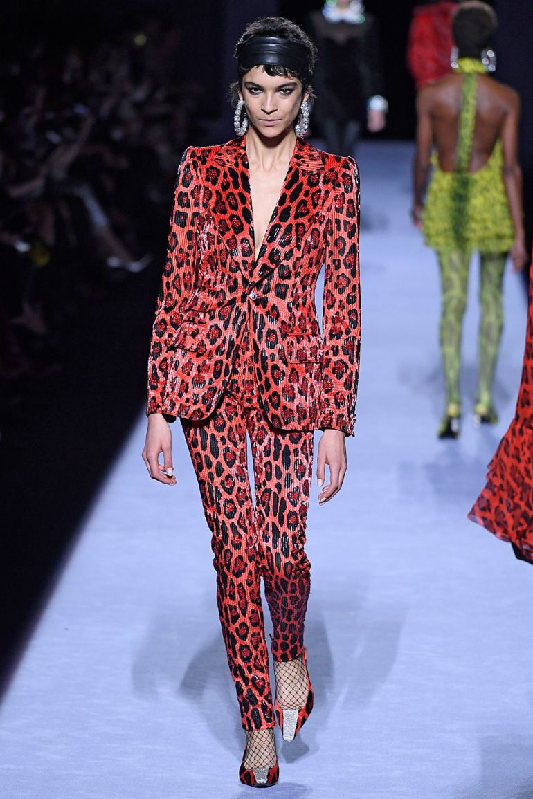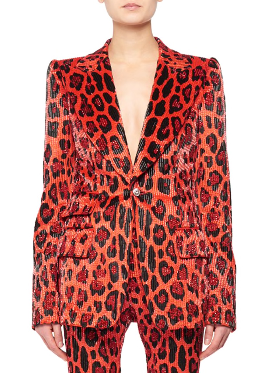Her Tom Ford FW20 suit included a single breasted bugle-beaded velvet jacket and $6,750 high rise bugle-beaded velvet pants both in a matching red jaguar print. The suit was exclusively available at Bergdorf Goodman, but is now sold out.
