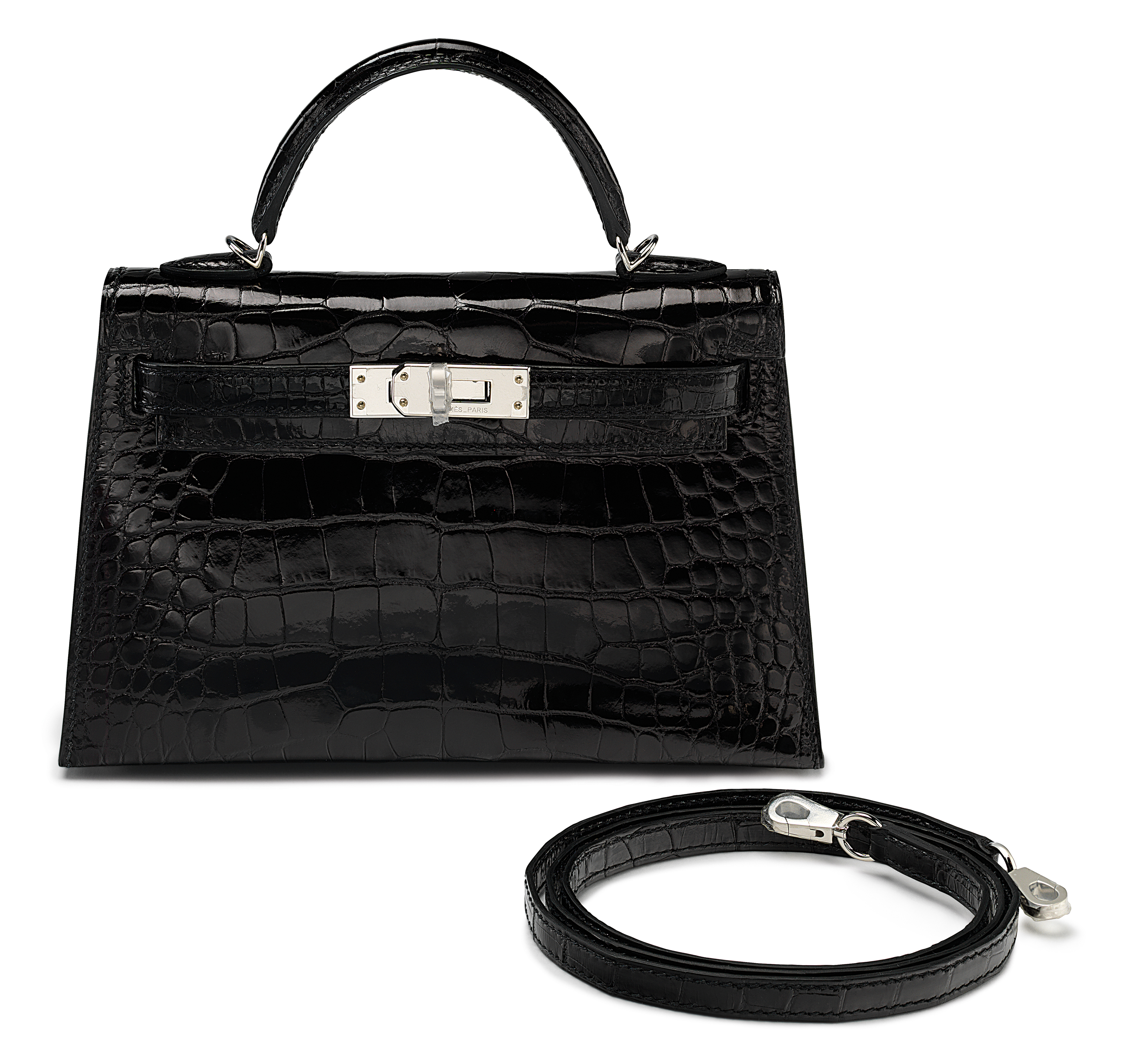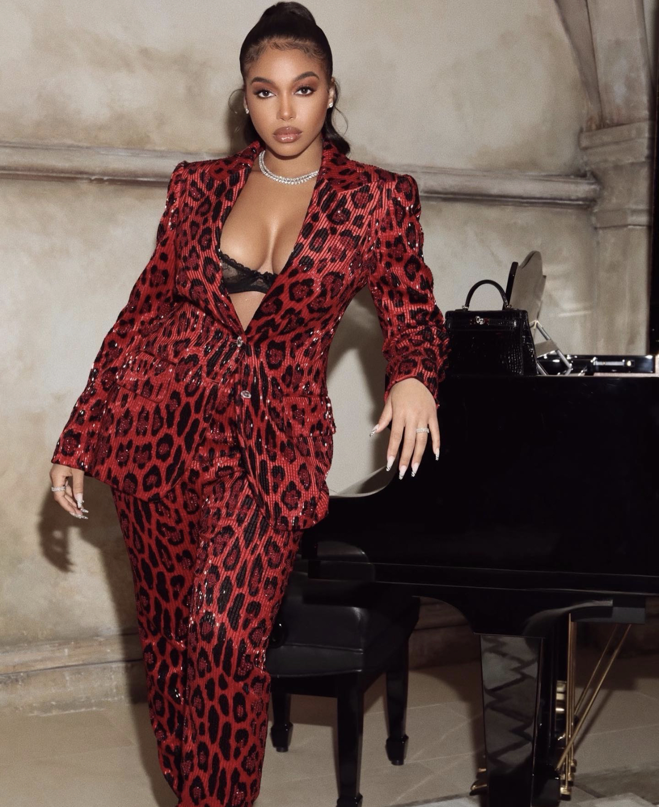 Lori Harvey wore a red jaguar print suit from Tom Ford Fall/Winter 2020 collection. She paired the look with a purposely-revealing lace black bra and black $45,000 Hermès Mini Kelly 20 croc bag which featured palladium hardware (sold out). For jewelry, she decided to keep it icy with diamond rings and a double layered necklace.