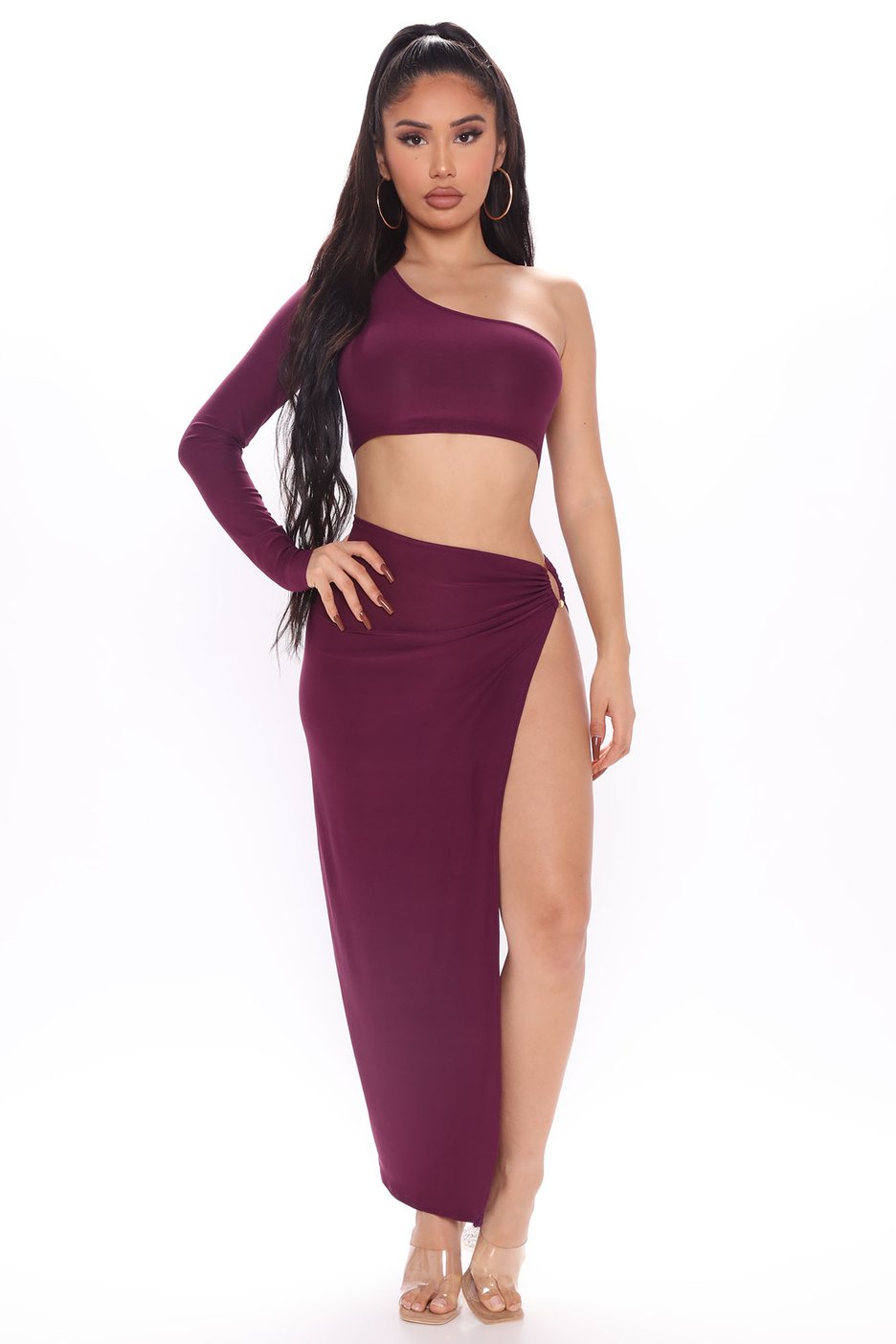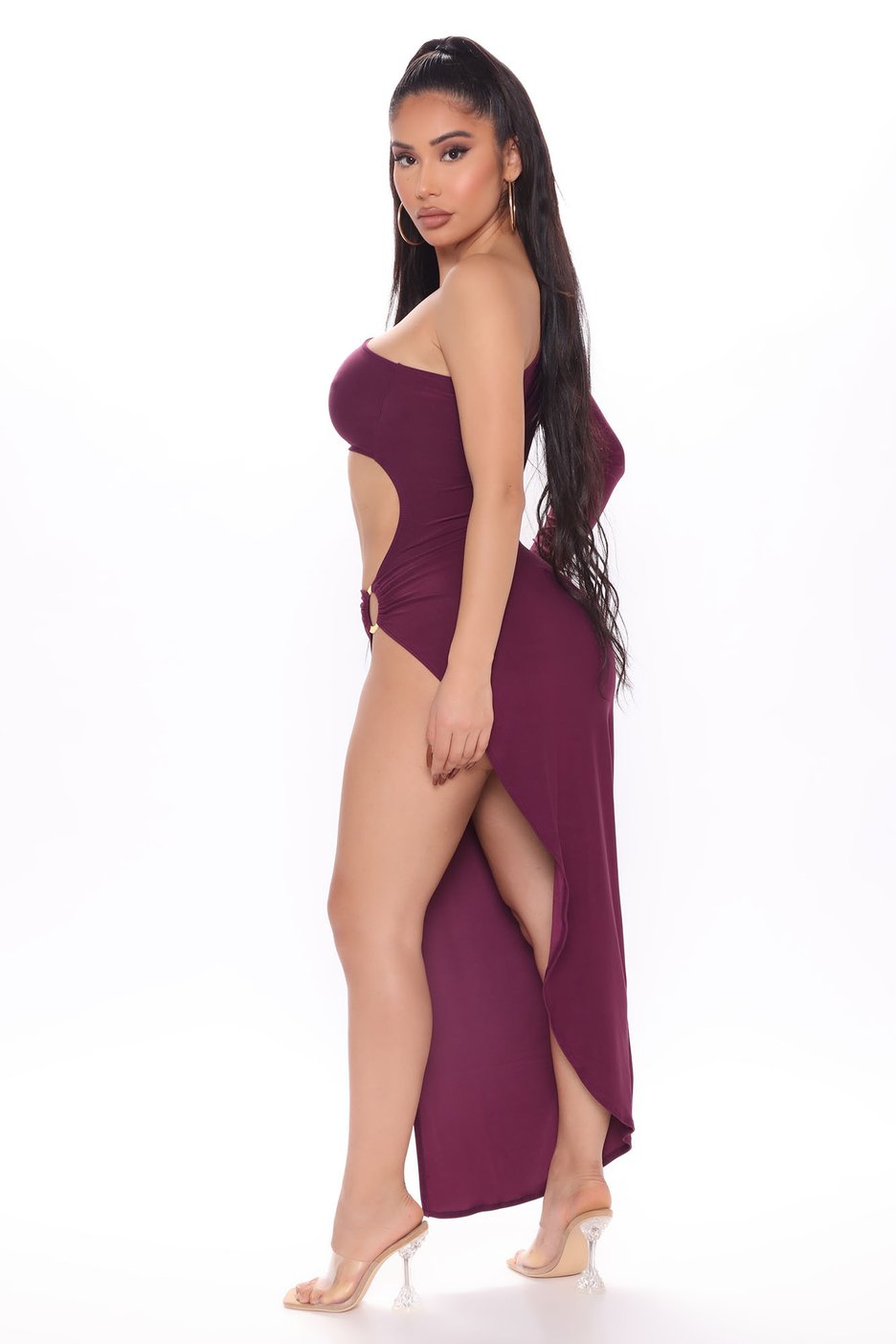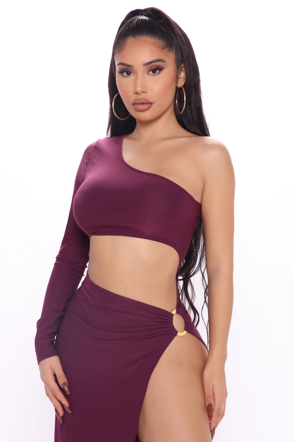 Iggy Azalea wore Fashion Nova’s $34.99 Slaying The Night Maxi Dress in the color plum. Iggy let the dress take the spotlight, rocking minimal accessories like a pair of gold hoop earrings. She opted for a high ponytail for her hairstyle of choice.